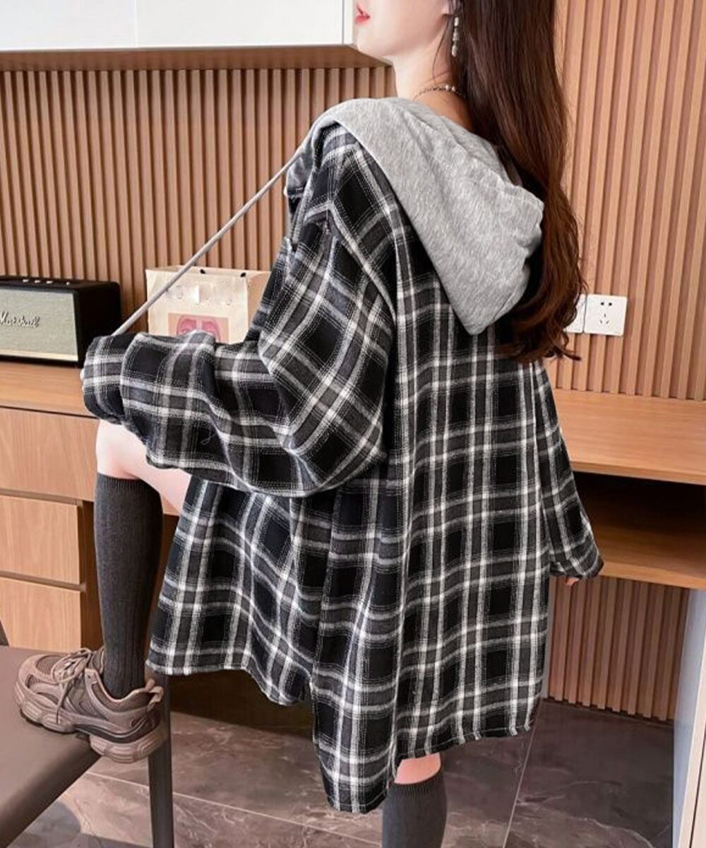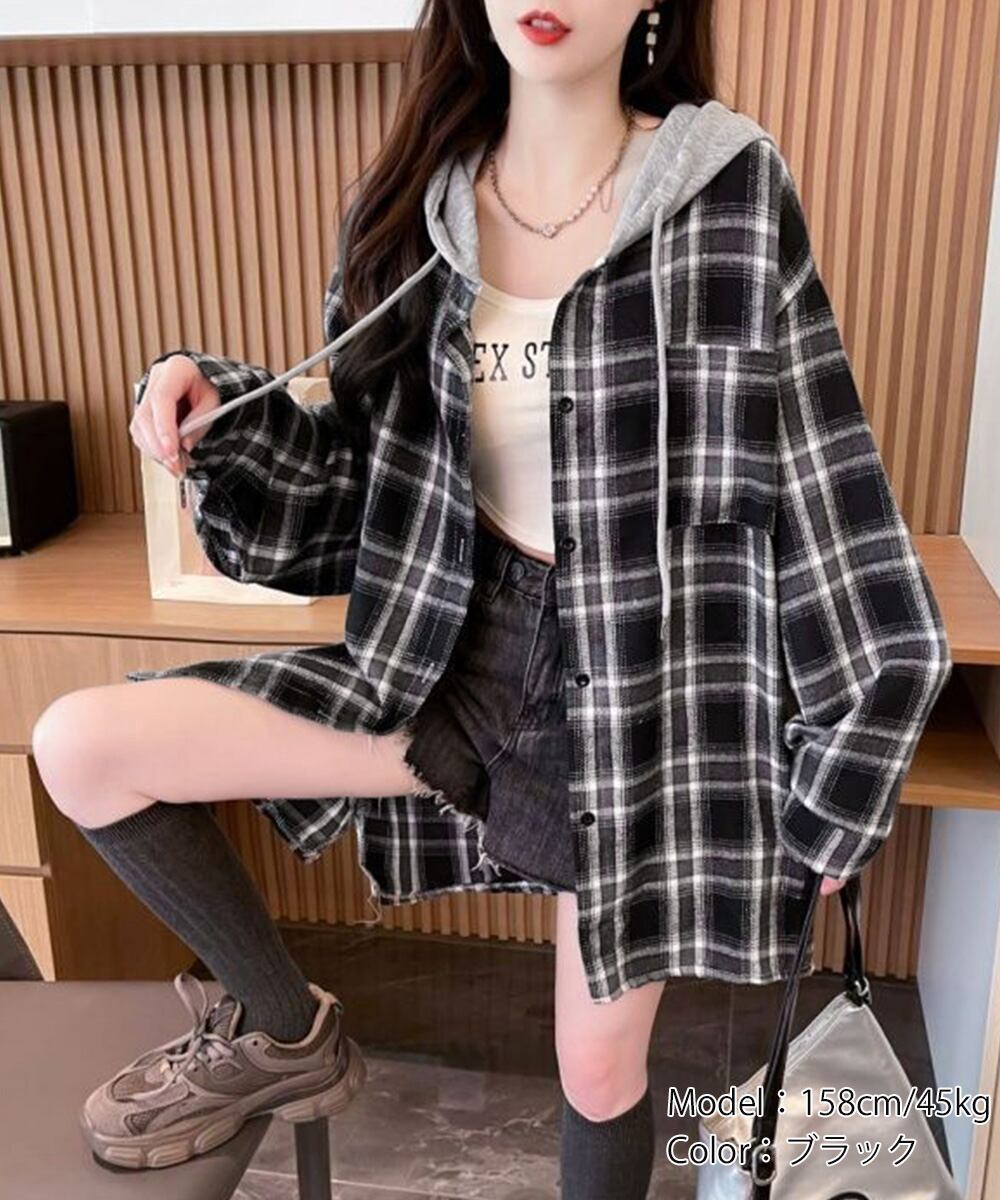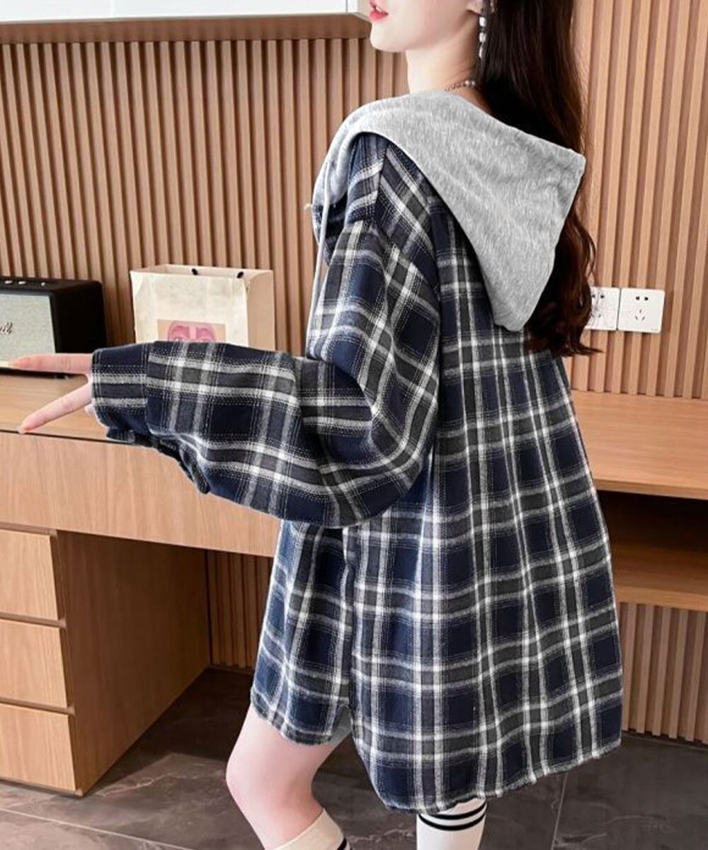 【日本倉庫即納】 チェック柄フーデッドシャツレディース秋冬