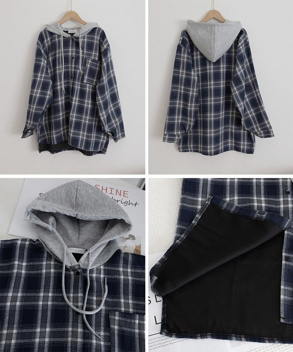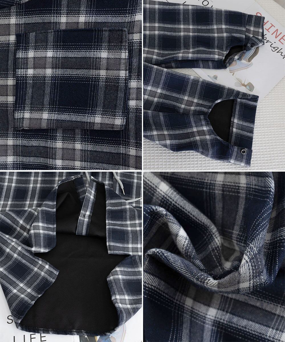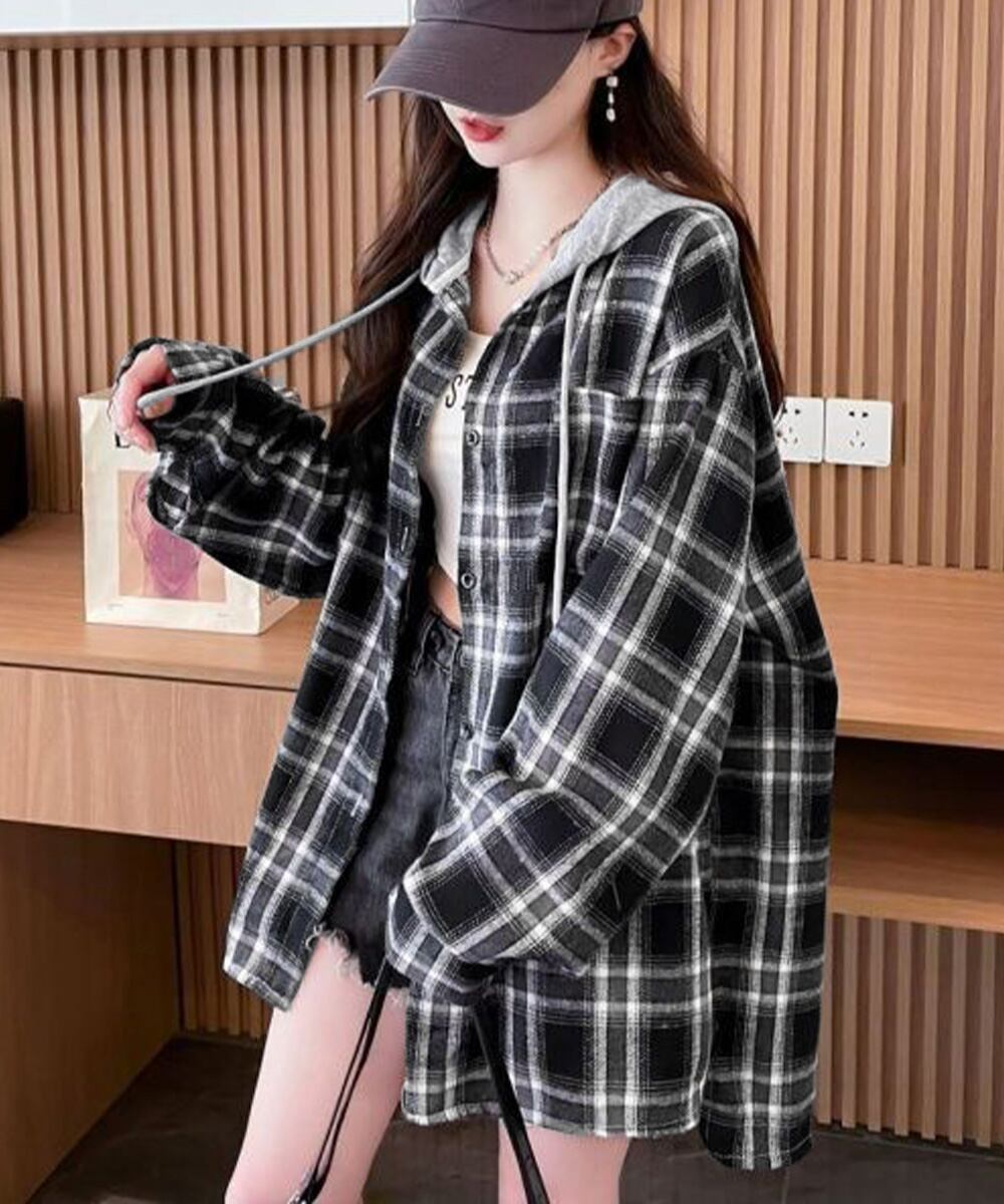 【日本倉庫即納】 チェック柄フーデッドシャツレディース秋冬