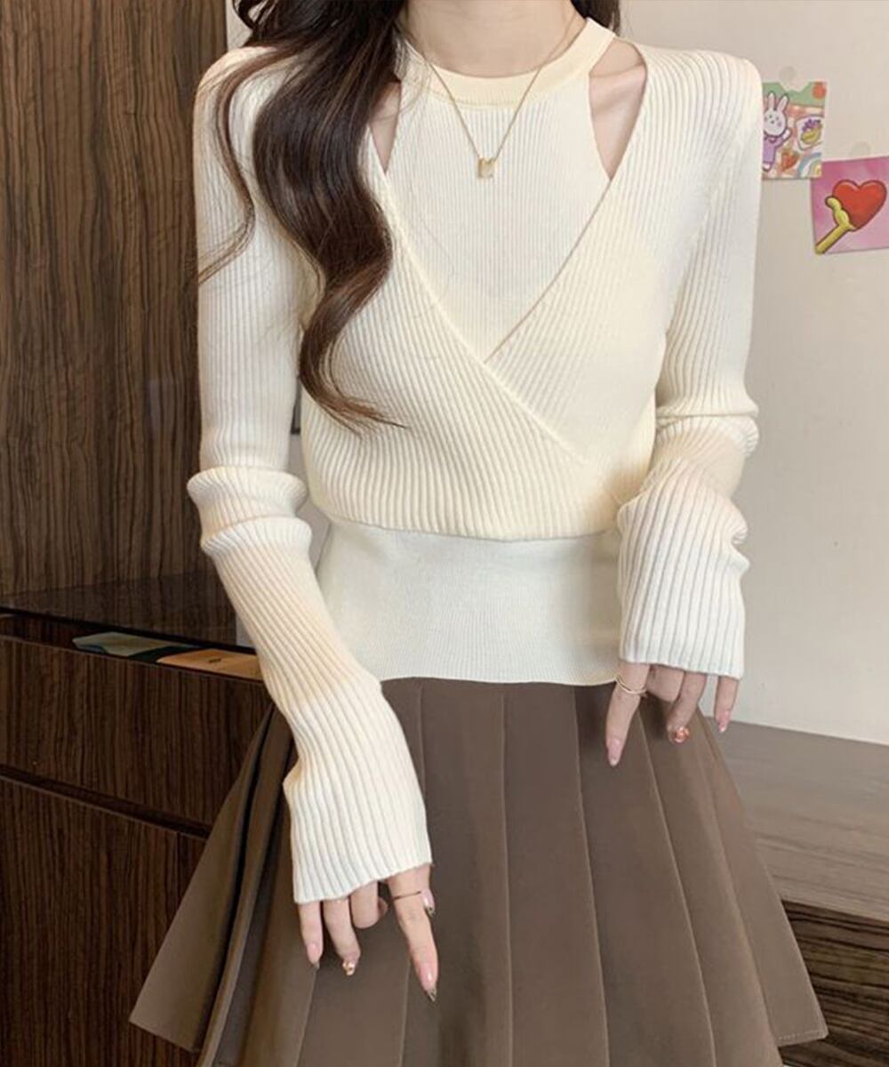 ニットウェア クロスデザイン リブニット ショート丈 着やせ服 ニットインナー 無地 韓国ファッション ニットセーター