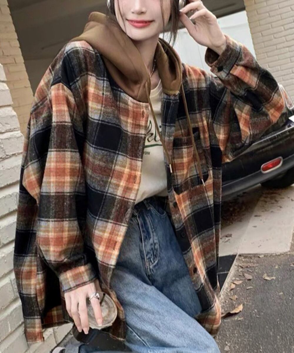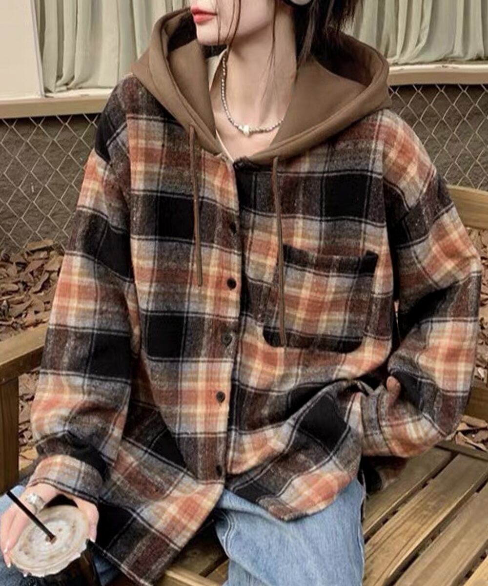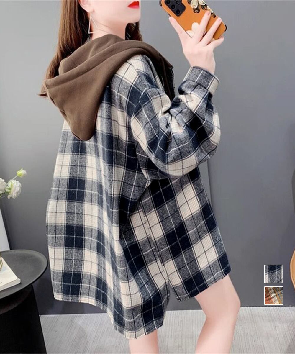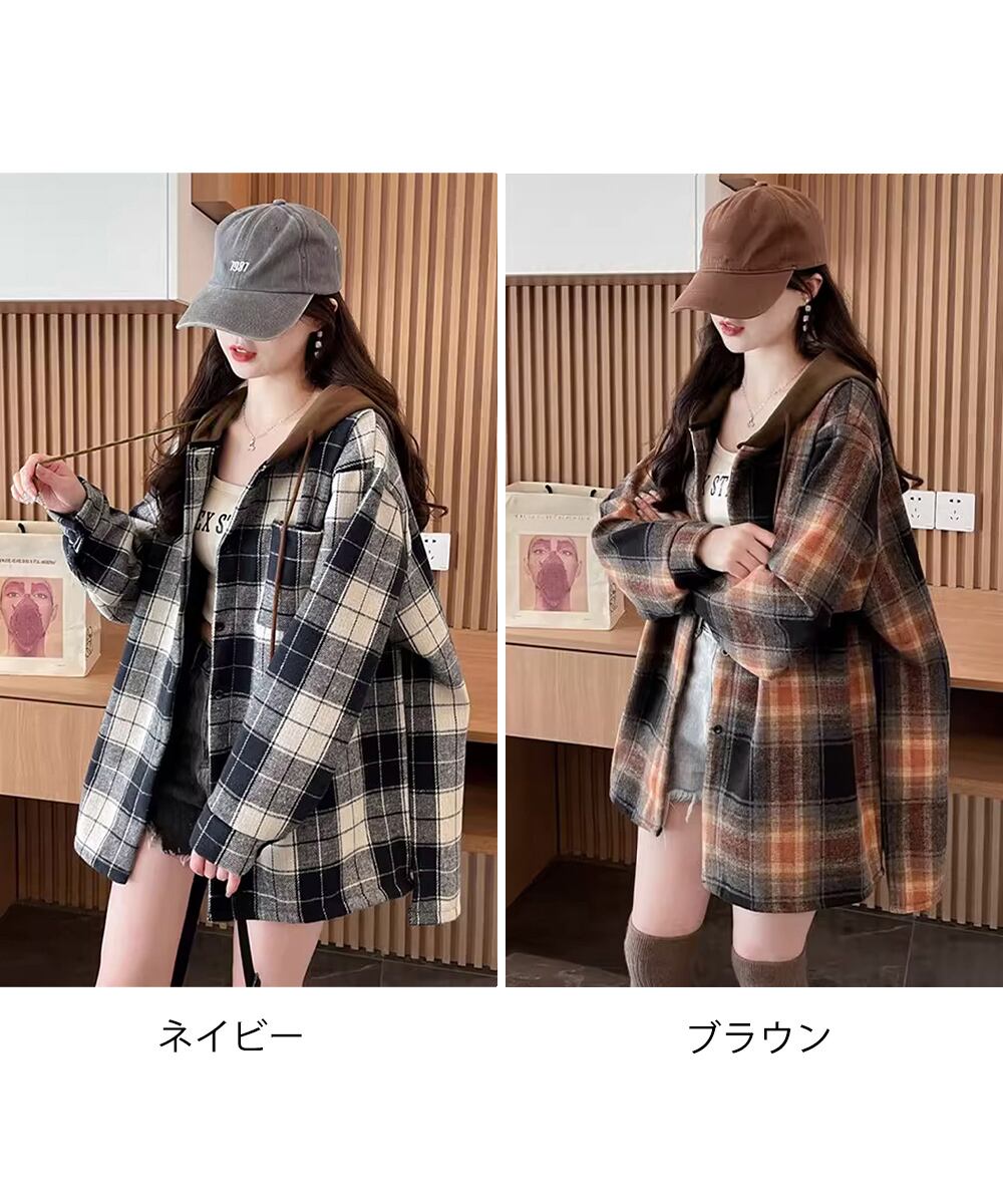 オーバーサイズ チェックシャツレディース 重ね着風 パーカーシャツ 長袖秋冬服 韓国風ライトアウター ネルシャツアウター