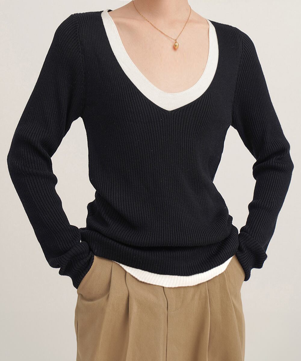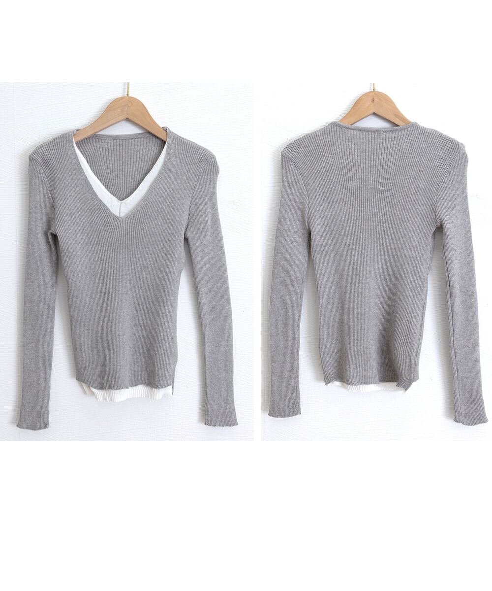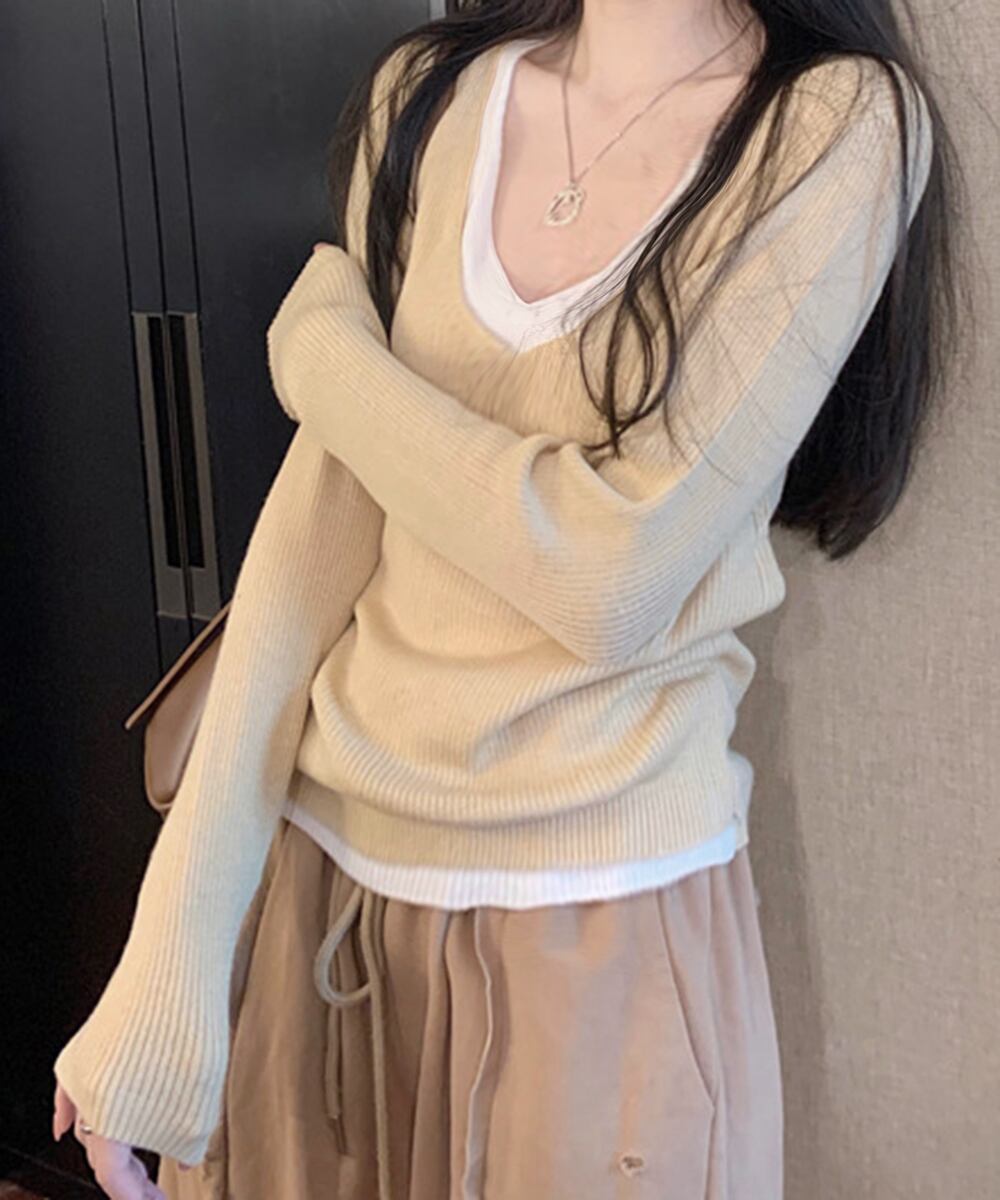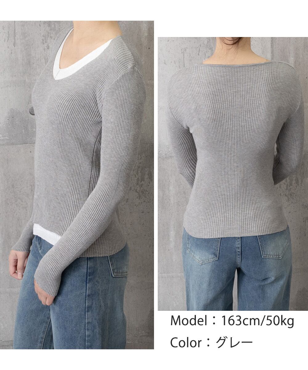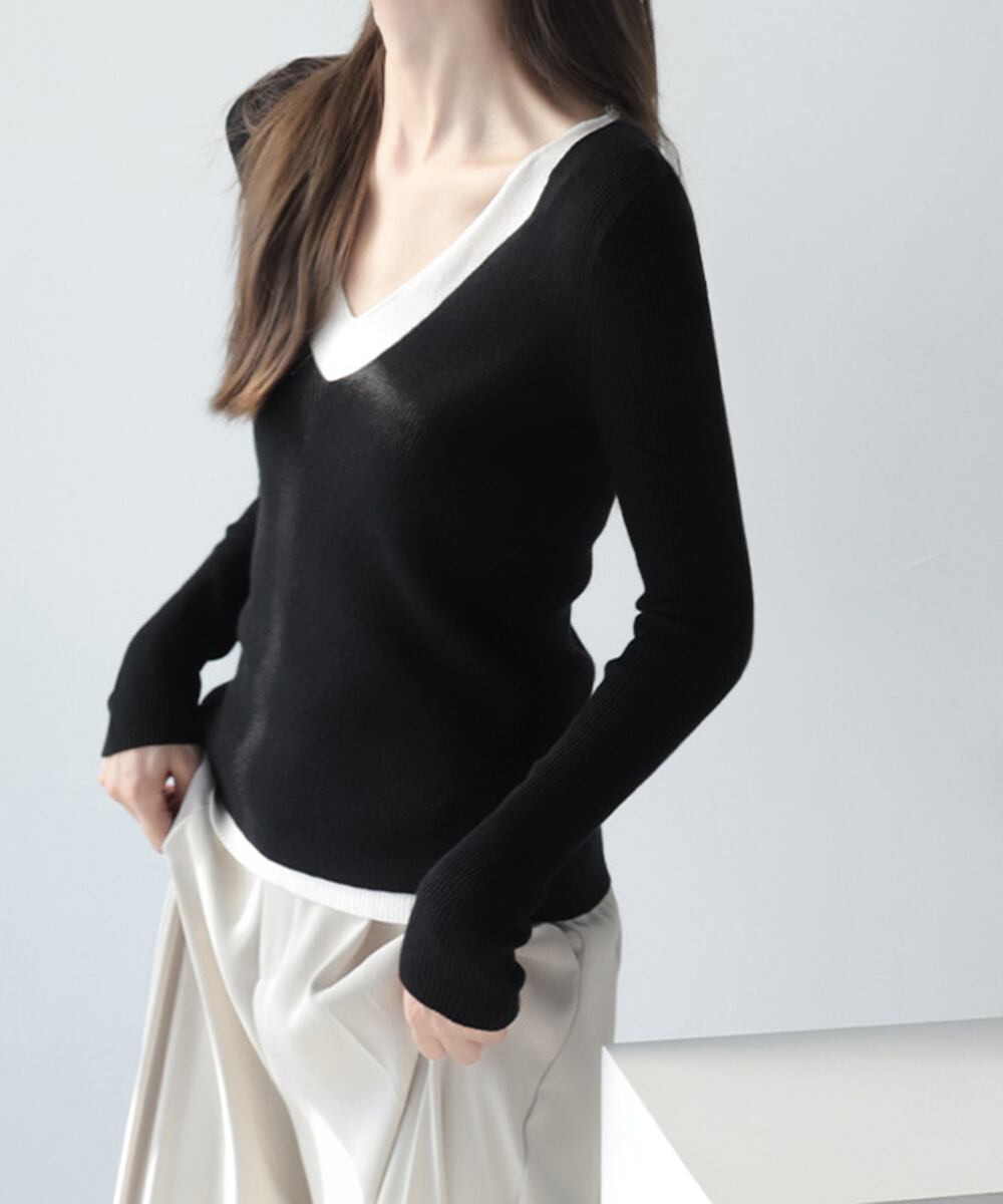 【日本倉庫即納】 ニットトップス レイヤード風 Vネック服