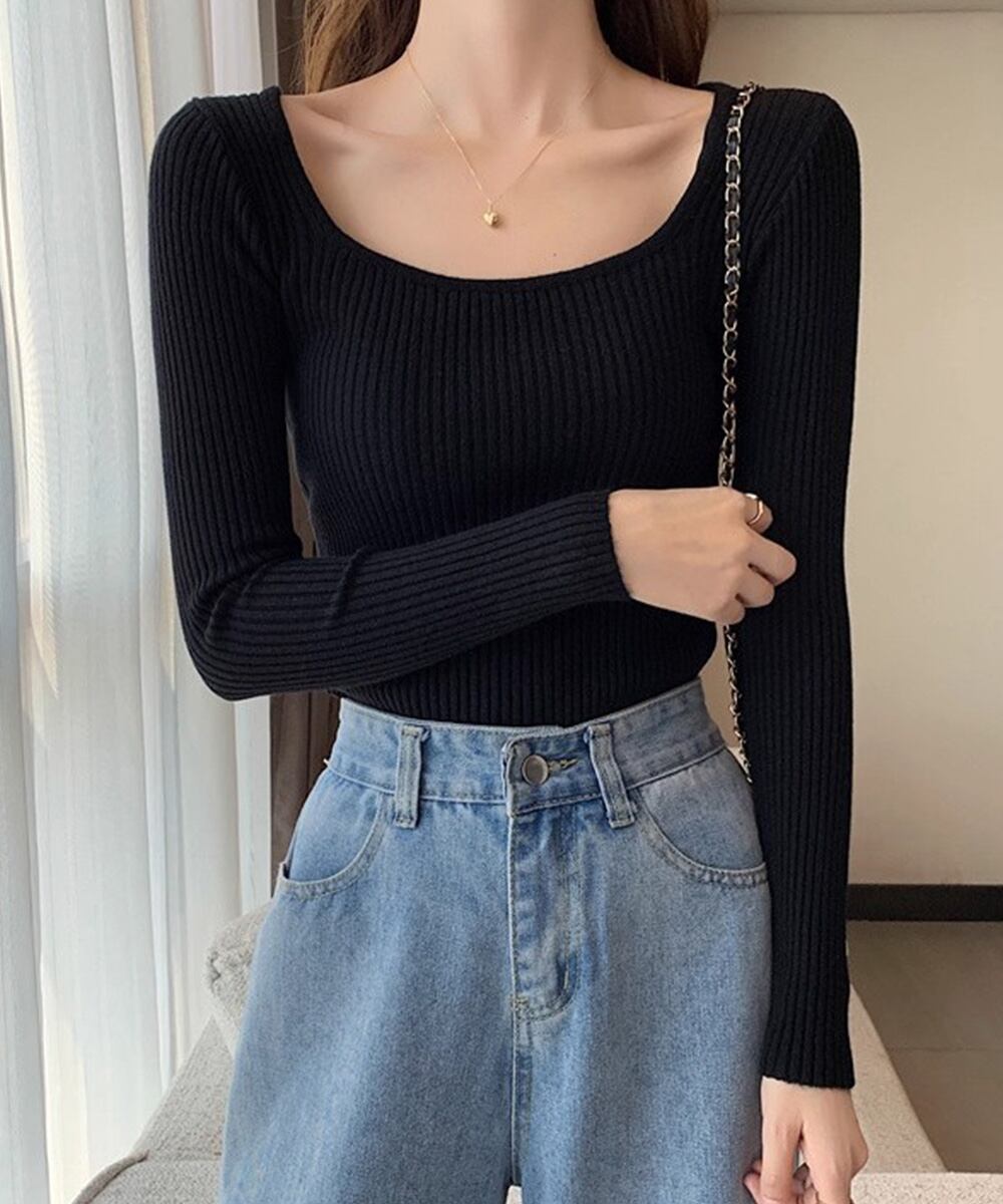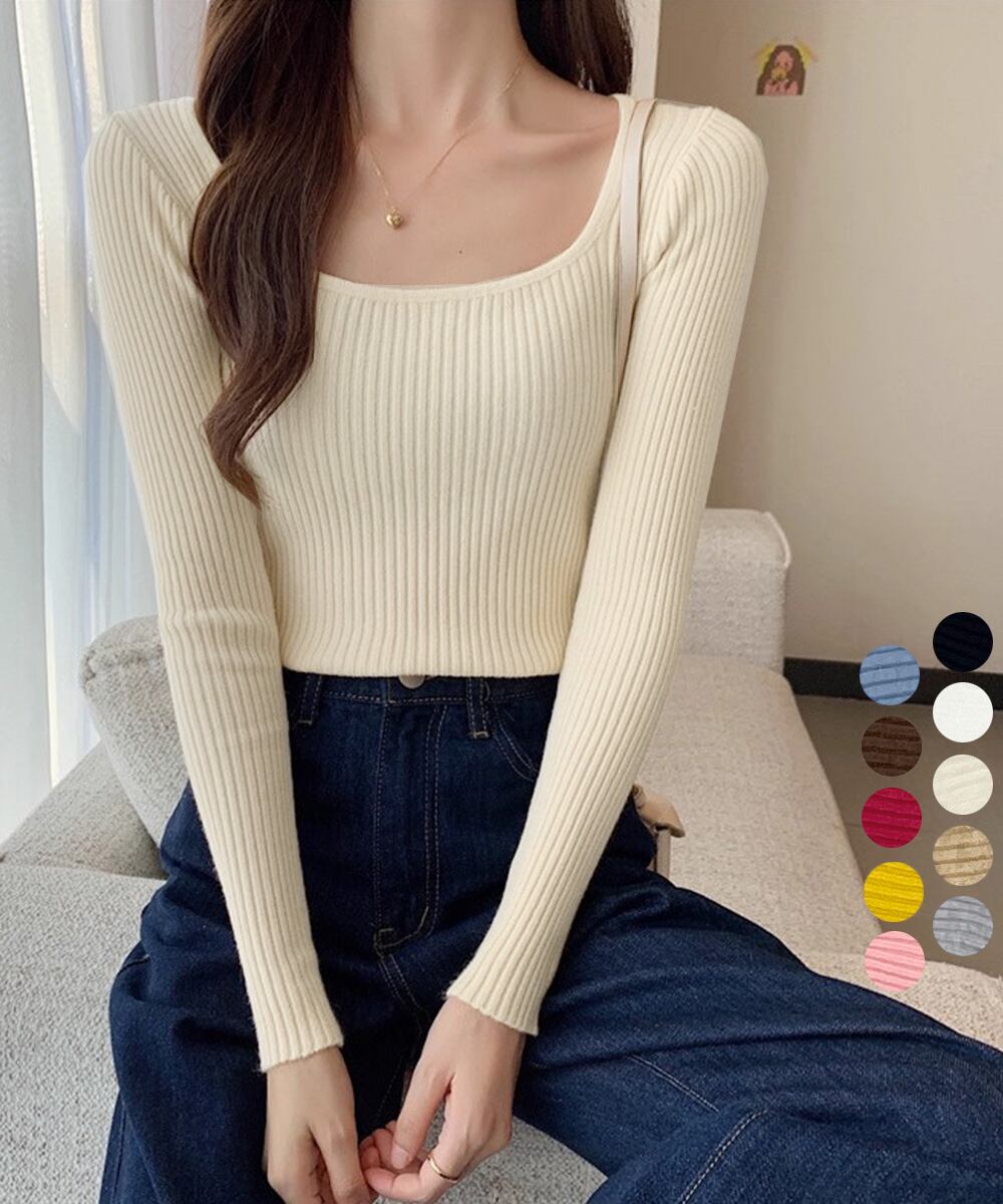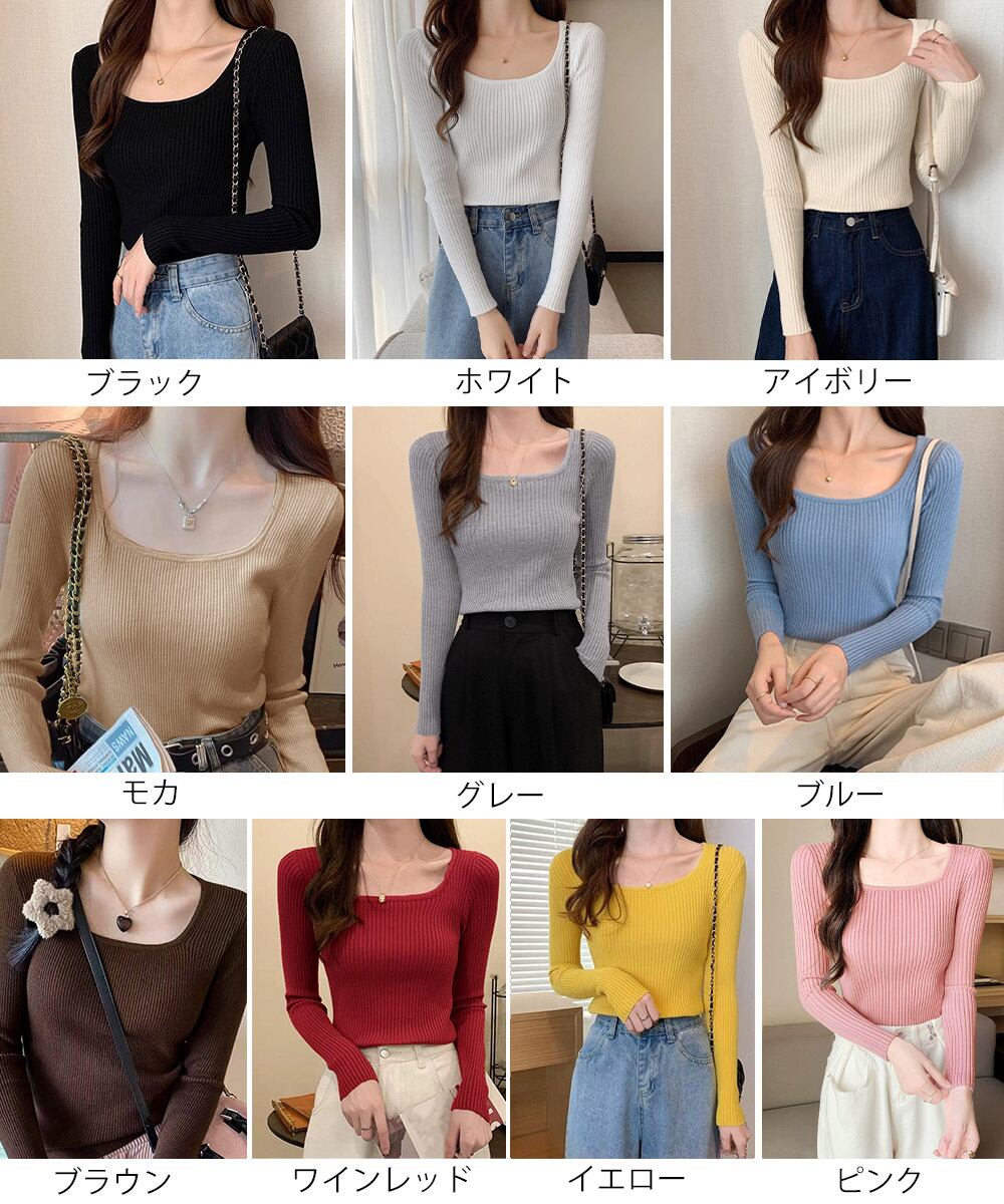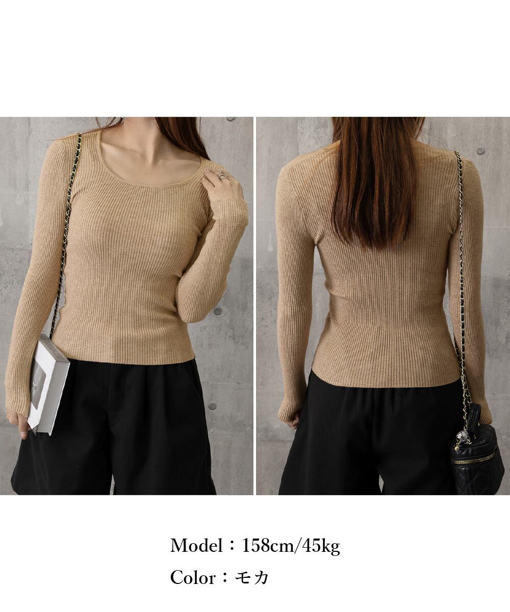 【日本倉庫即納】 Uネックリブトップススクエアネックニット
