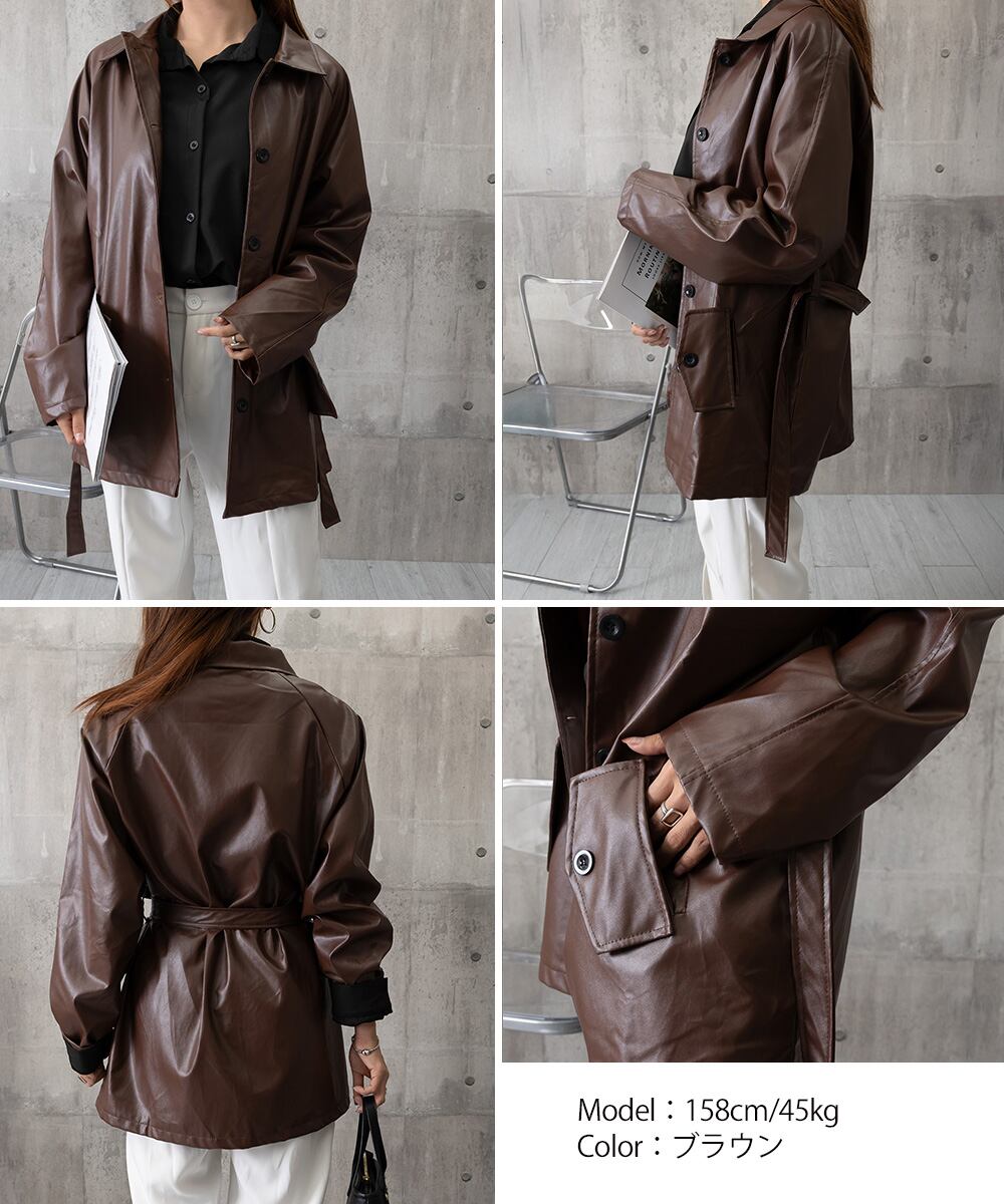 レディースウエストマークフェイクレザージャケット 合皮テーラードジャケットお洒落 ベルト付きアウター秋冬 カジュアル上着