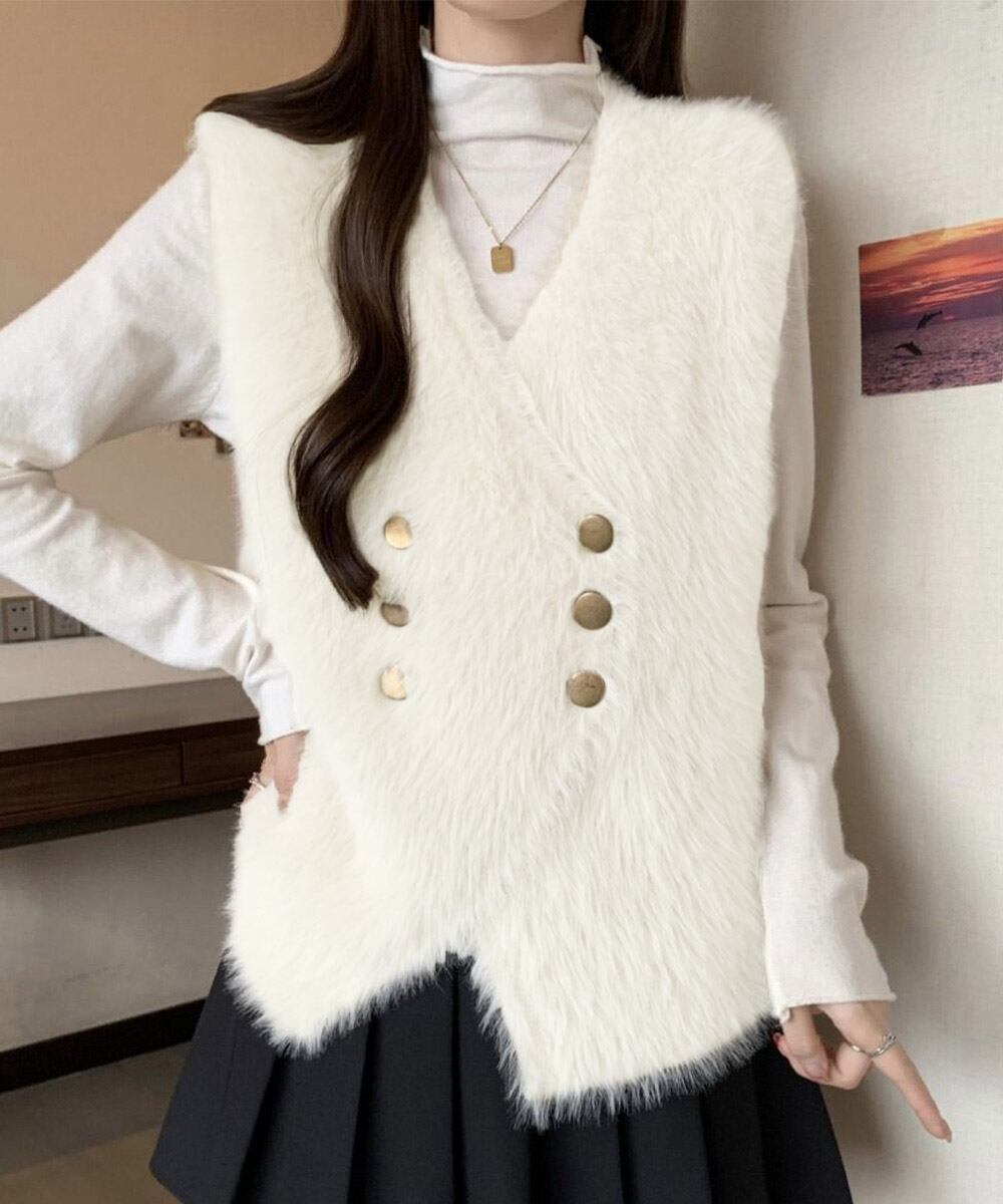ふわふわのフェイクファー素材を使用したVネックのダブルボタンベスト。