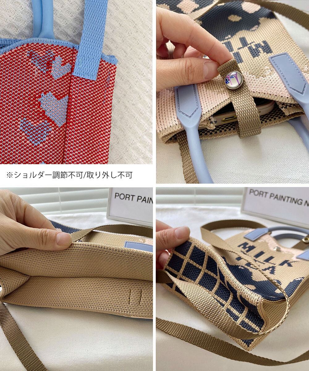 カラフルでポップなデザインが目を引く、ニット素材のミニショルダーバッグ。