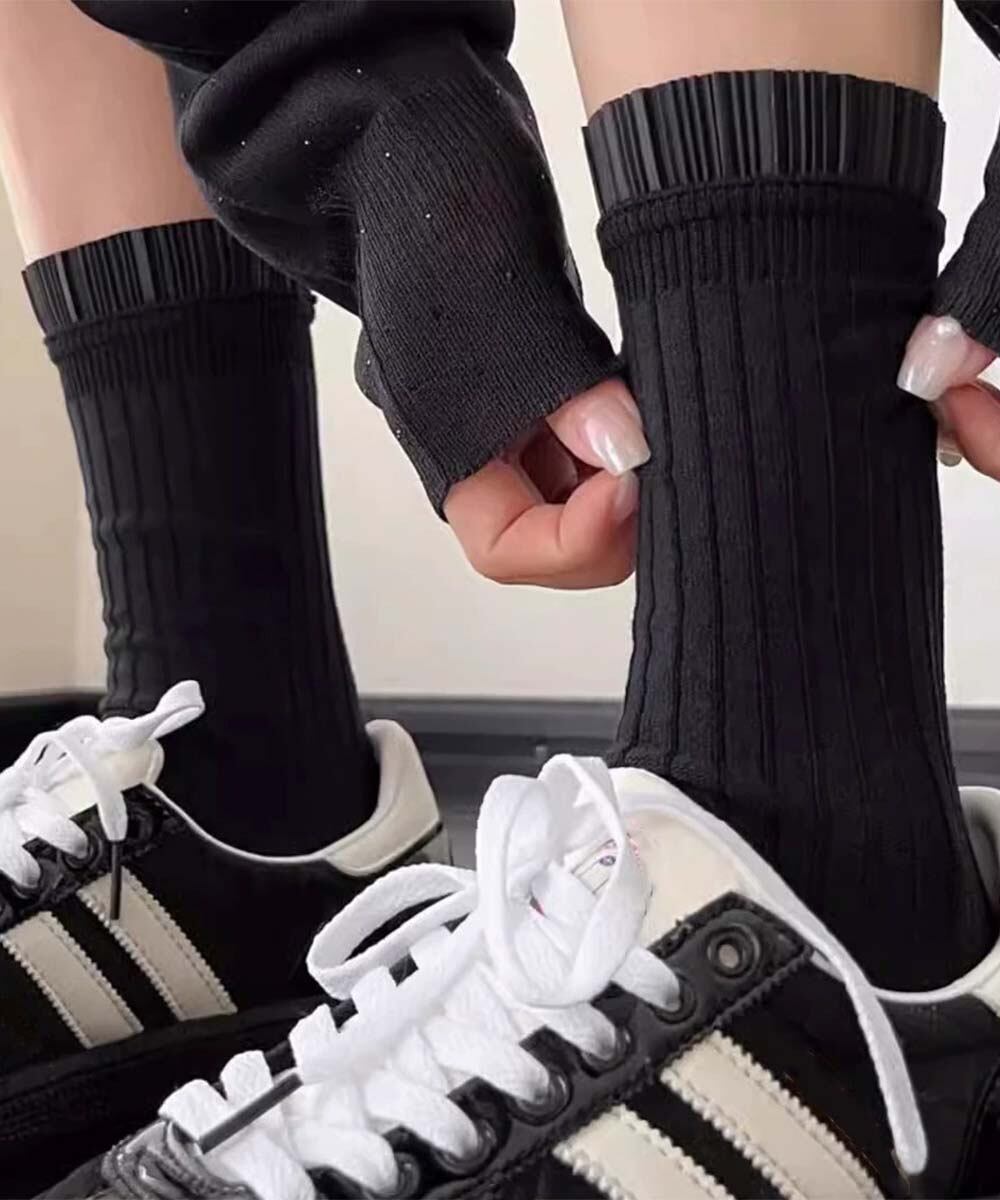 プリーツフリルが目を惹くリブ編みのミドル丈ソックス。