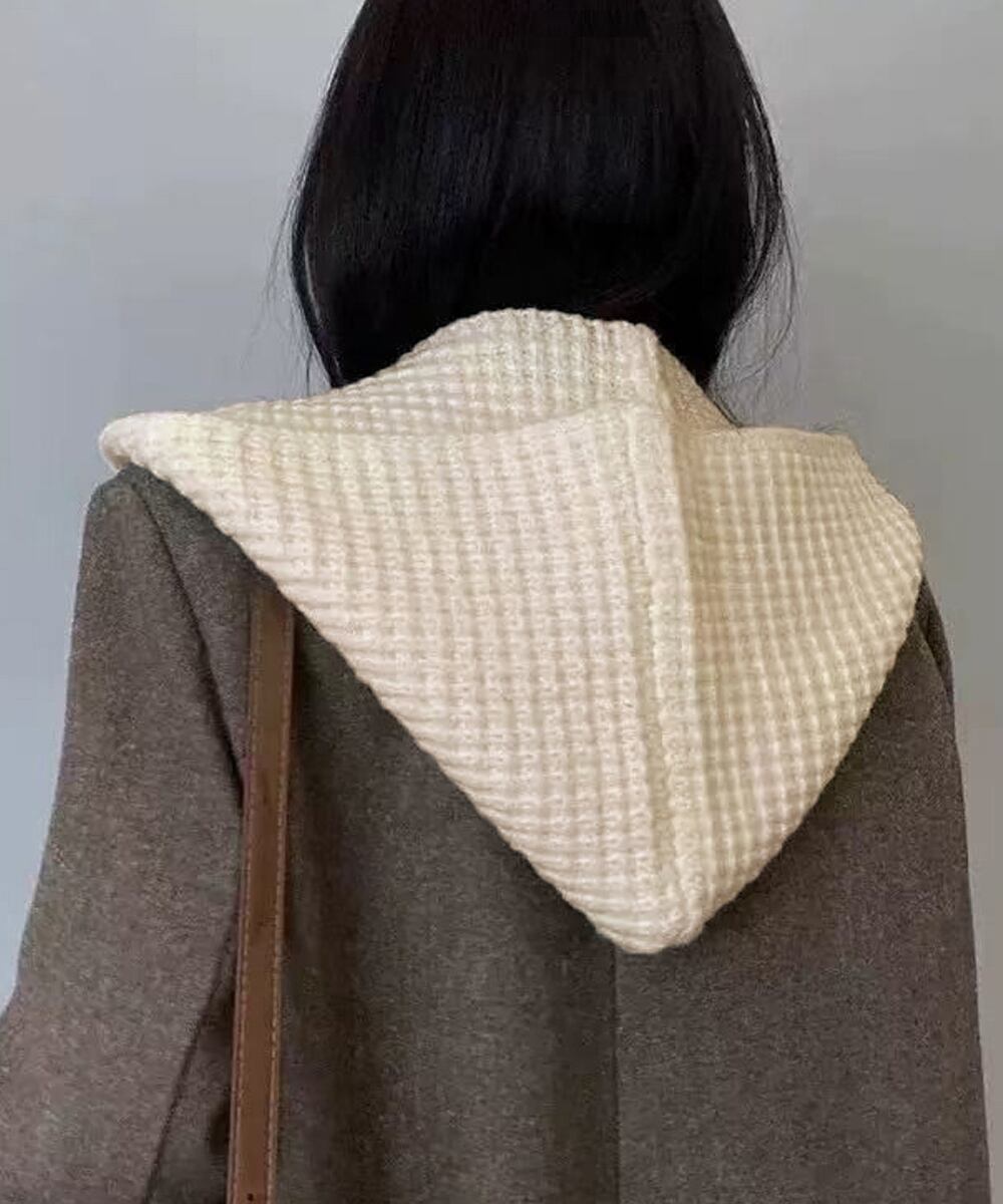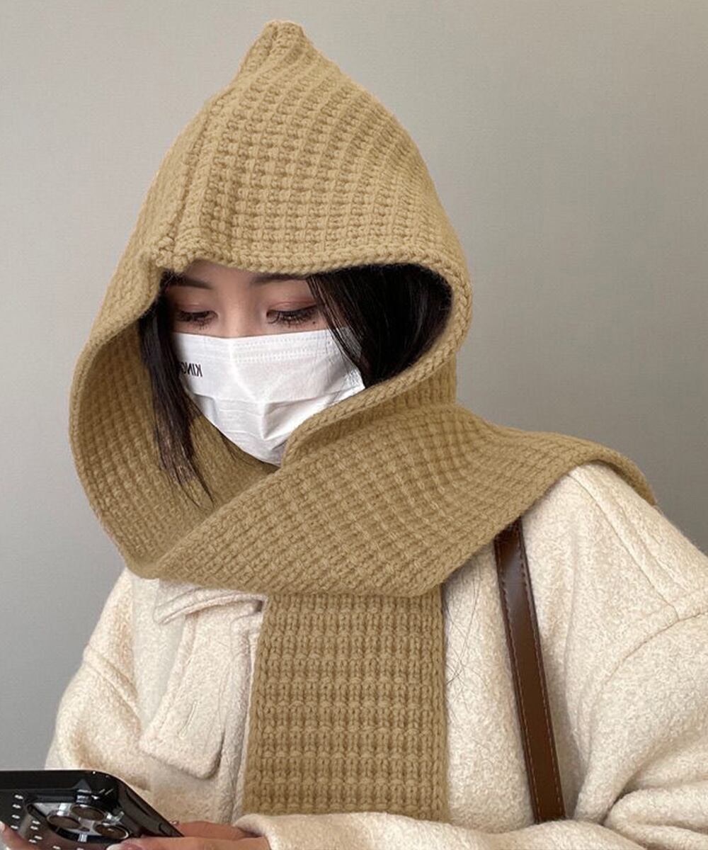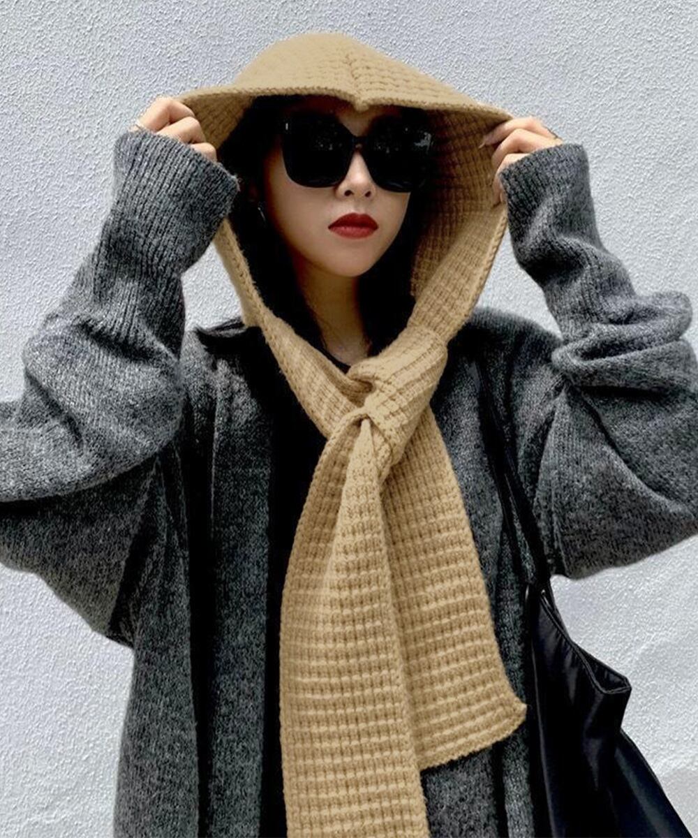 フードとマフラーが一体化したデザインのニットフードマフラー。