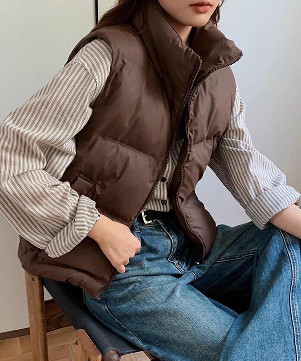 大人っぽくて上品なコーデが決まる、軽くて暖かいダウン風中綿ベスト。