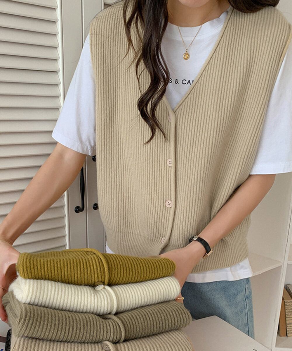 【日本倉庫即納】 リブニットベスト前開きニットジレVネック