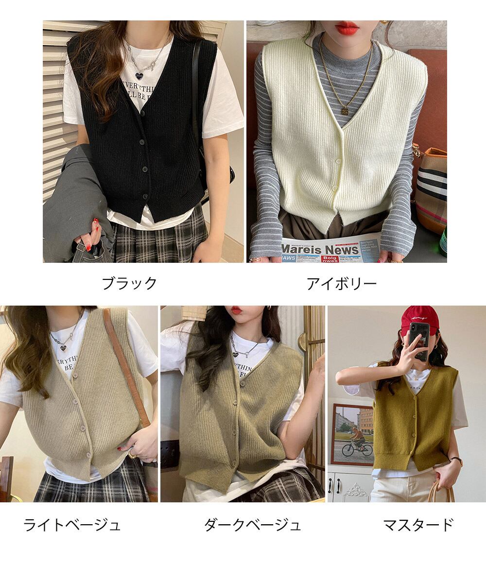 ボタン付きトップス 秋冬レイヤードジレ 袖なしニット着やせ