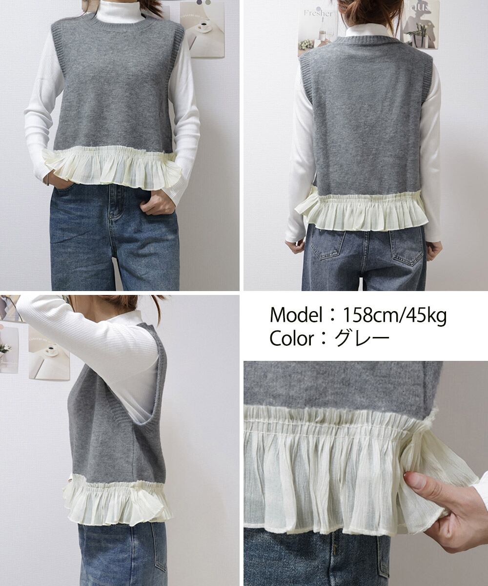 ベストセーター編み デイリーウェア女子 フリルデザインジレ