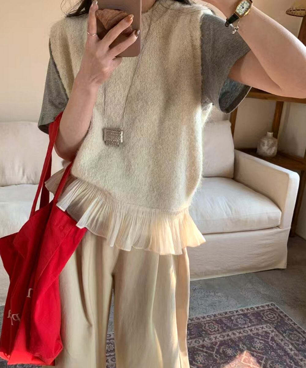 フリルベスト 韓国ファッション レイヤードコーデ ノースリーブニットトップス 着やせニットジレ 春秋冬 プルオーバー無地