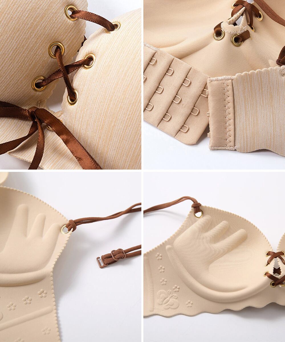 ブラジャーはレースアップ仕様で、ぎゅっと結ぶことでバストを引き寄せる。