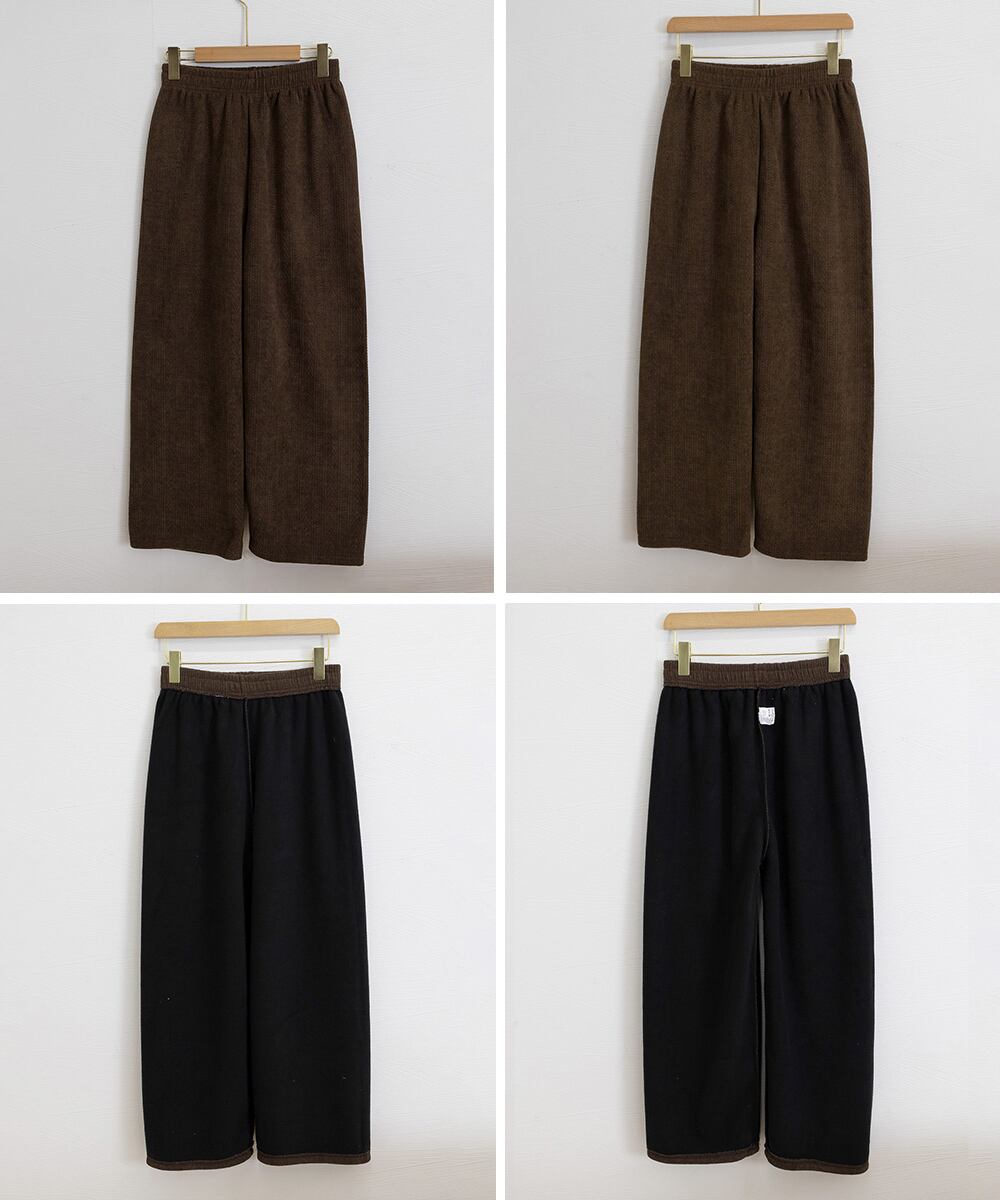 裏起毛素材で仕上げた、リブ編みのワイドパンツ。