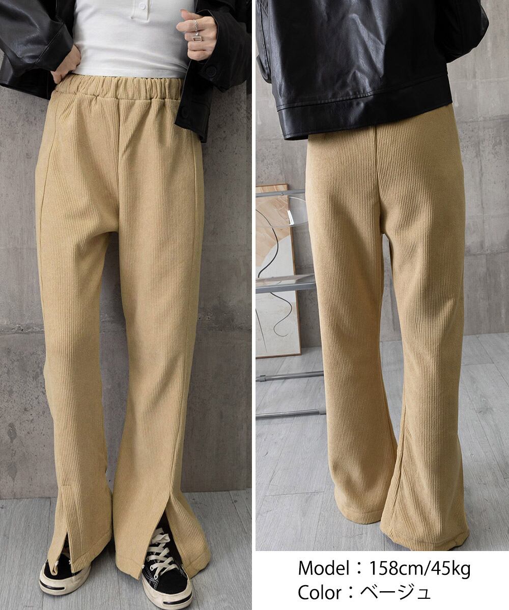 秋冬にぴったりな、暖かみのあるコーデュロイ調素材のセミフレアロングパンツ。