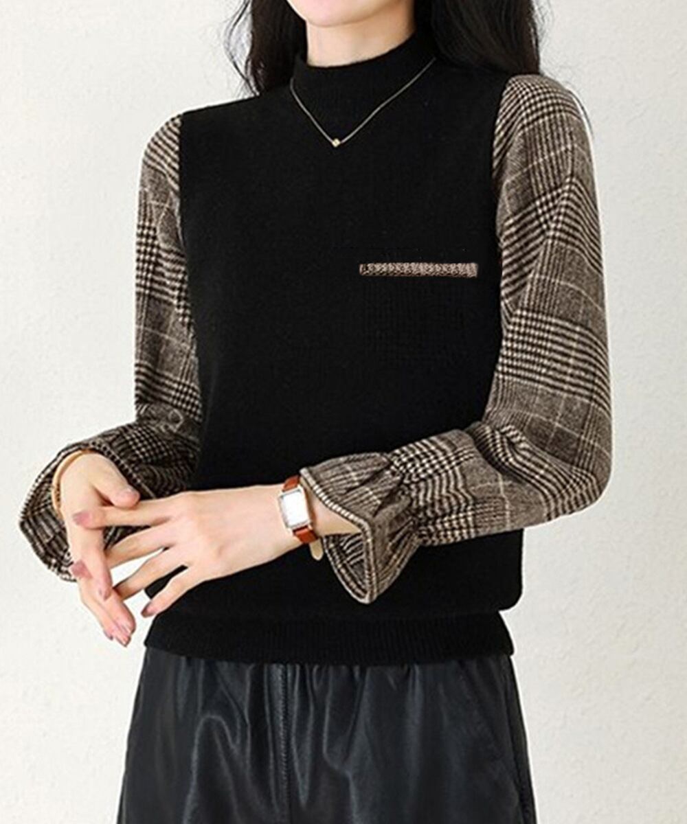 チェック柄の袖が目を引く、異素材ドッキングのハイネックニットトップス。