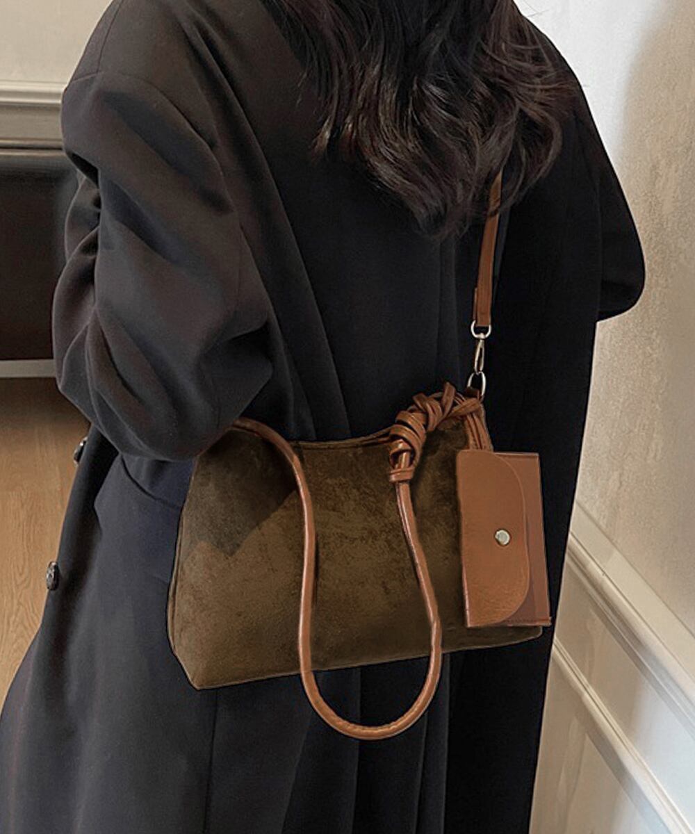 スエード調素材で仕上げたミニポーチ付きレディースショルダーバッグ。