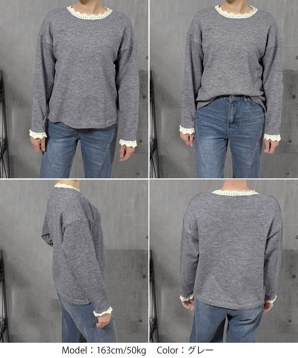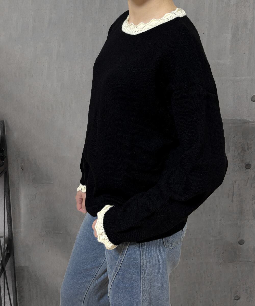 衿と袖口に配色切り替えデザインを施した、女性らしさを引き立てるシンプルなニットトップス。