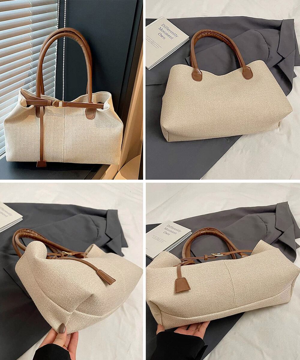 ナチュラル風生地にレザー調のハンドルとベルトが映えるレディーストートバッグ。