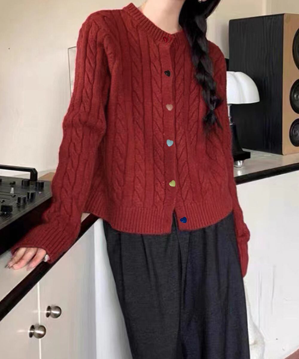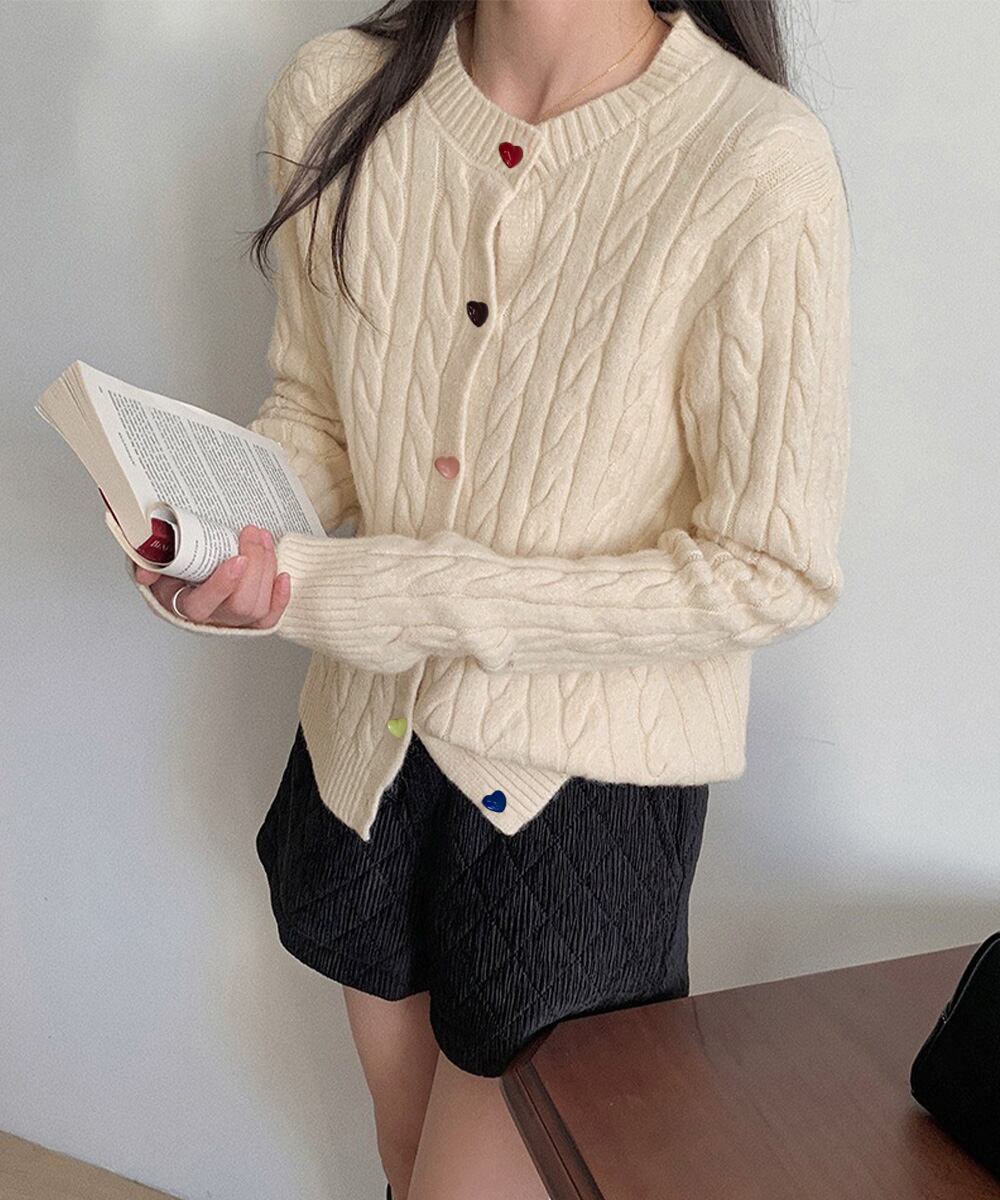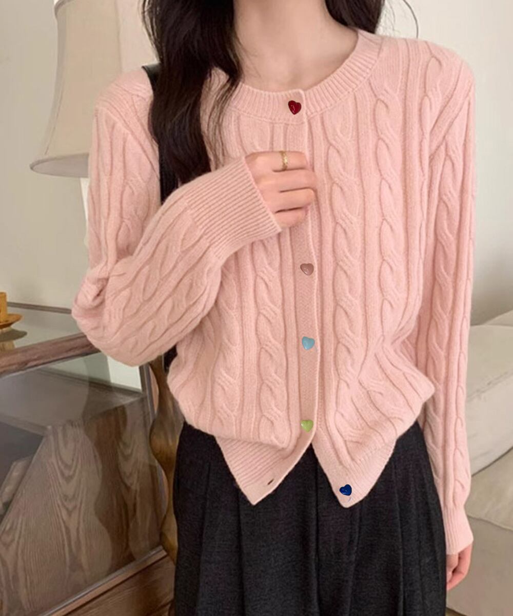 レディース カラーハートボタンニットトップス クルーネックニットセーターきれいめカジュアル ニットアウター お洒落秋冬服