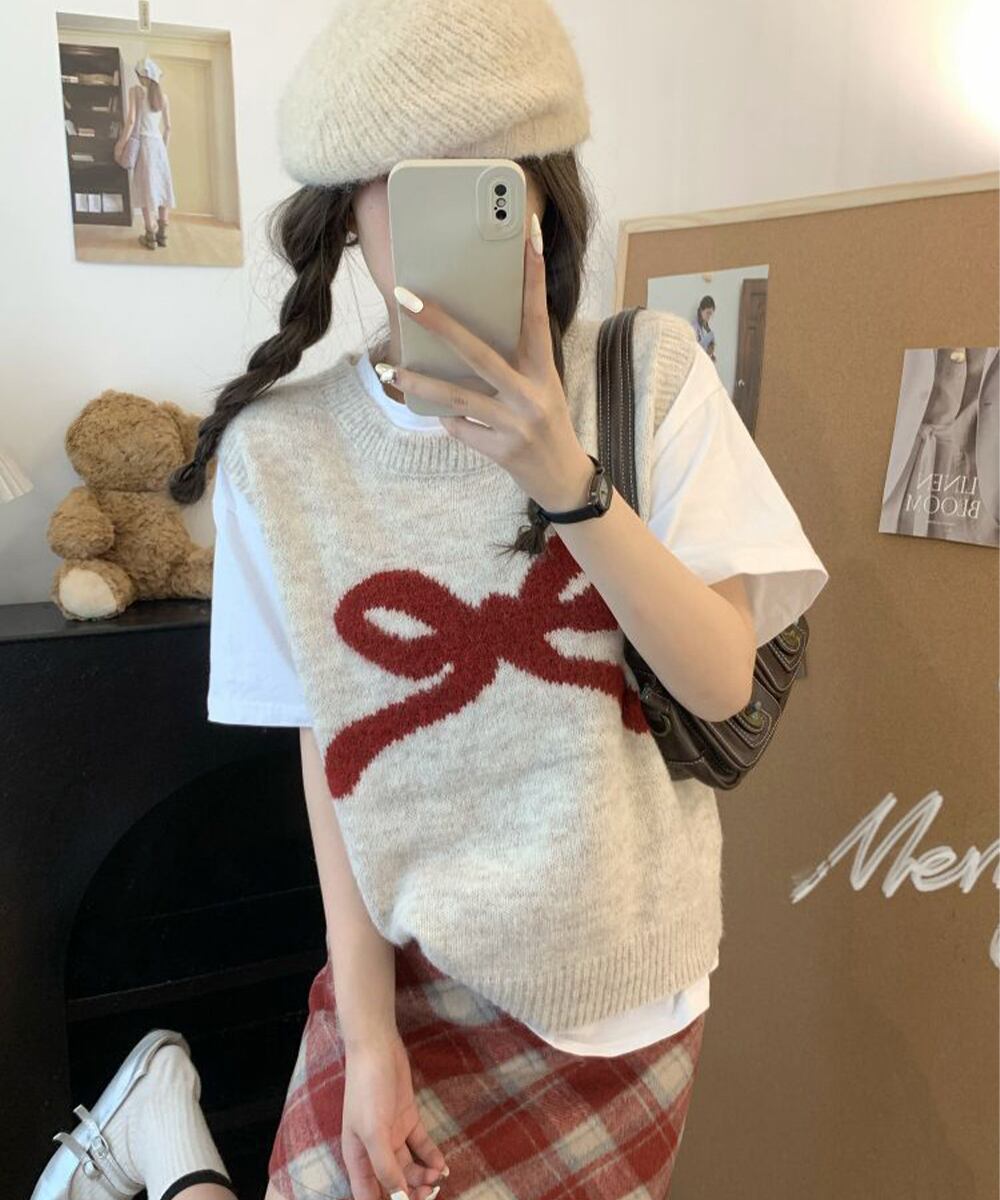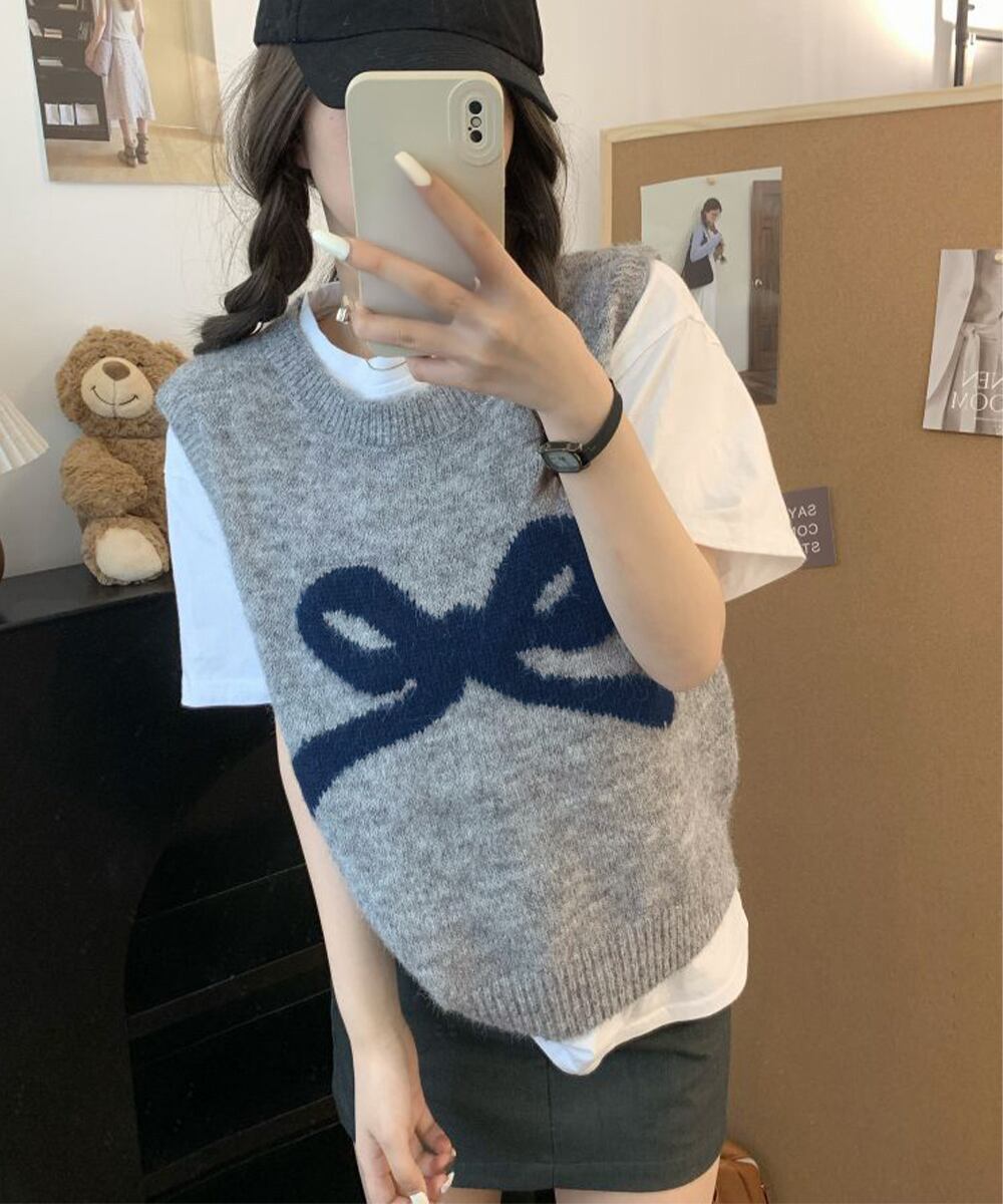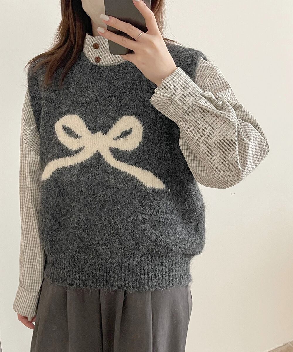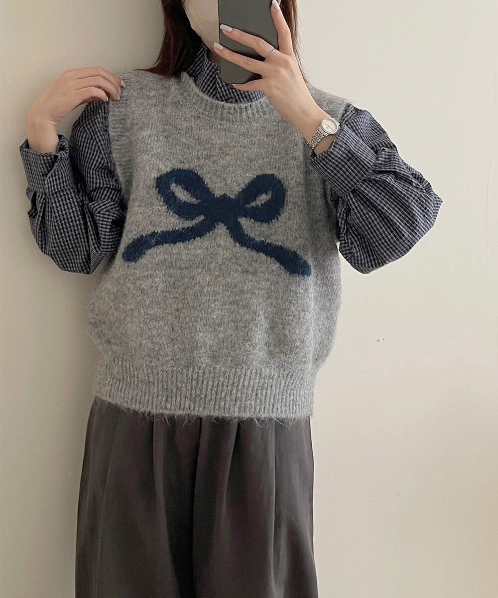 ニットトップス ノースリーブ リボン柄 編み 体型カバー 重ね着 着やせ 大人 可愛い カジュアル オルチャン 春秋冬