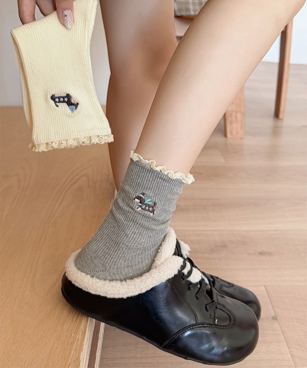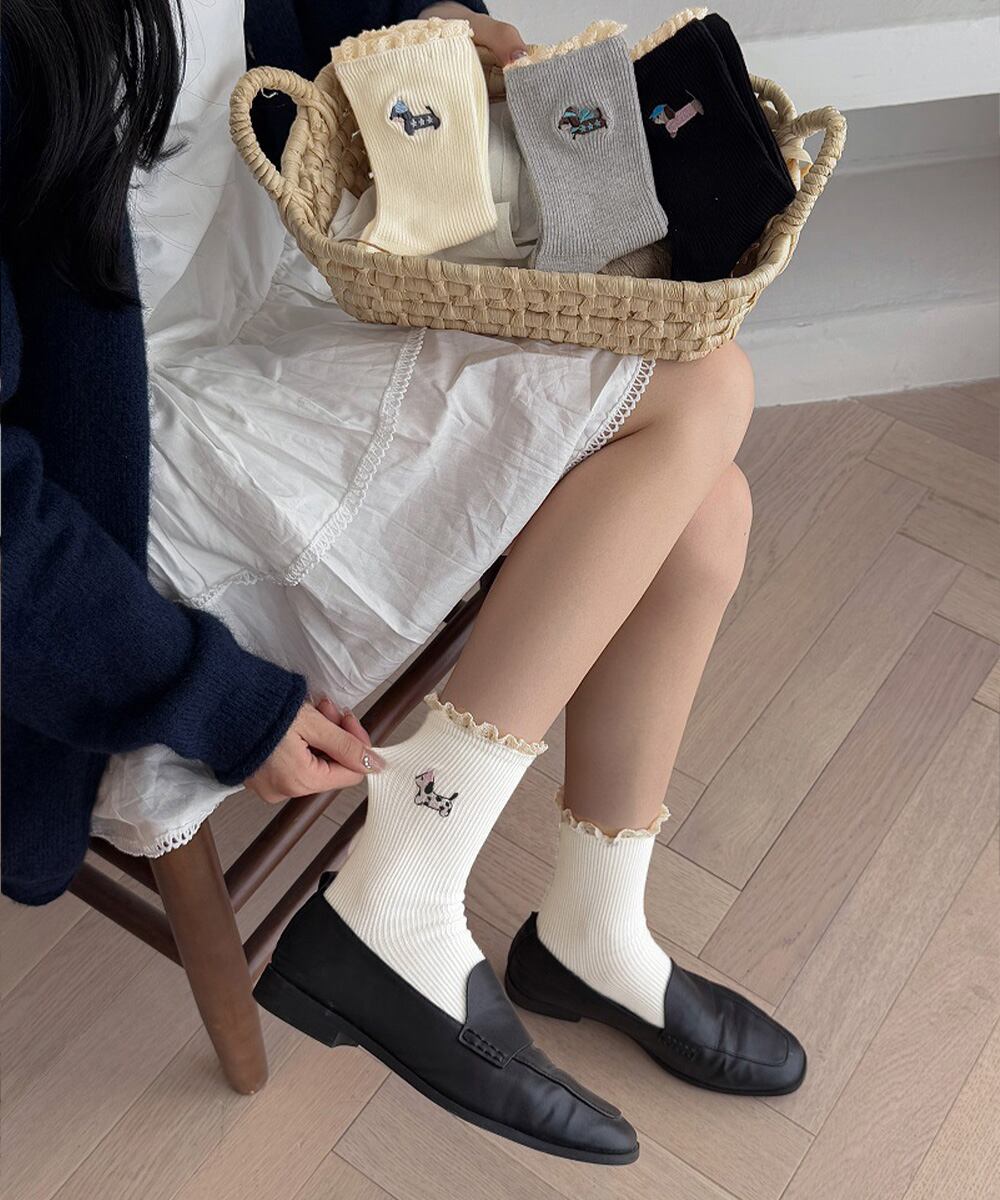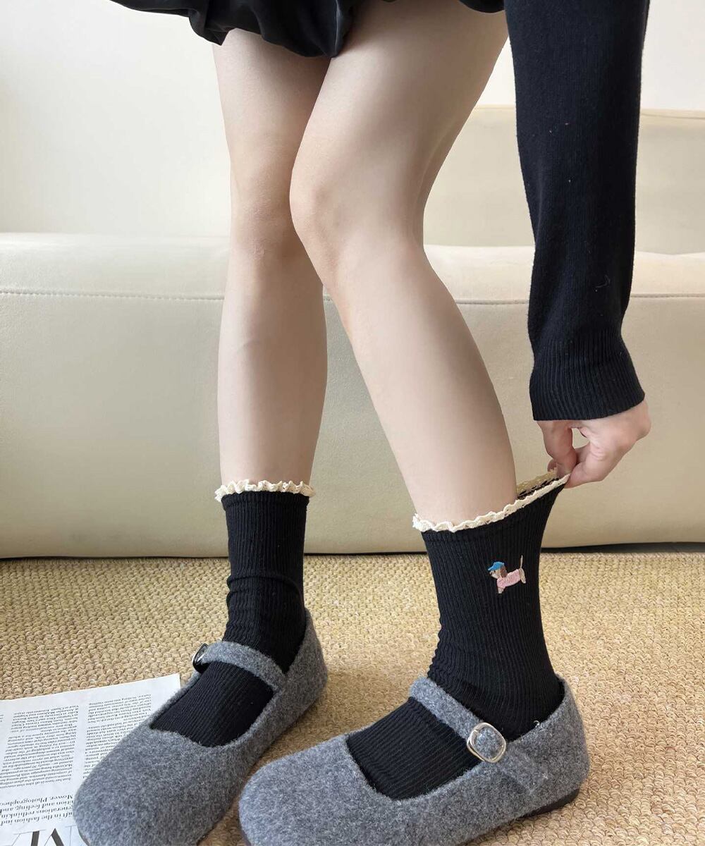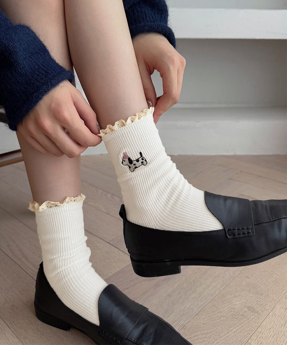 可愛い犬の刺しゅうがポイントのフリル付きリブソックス。