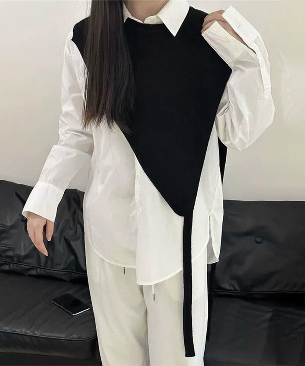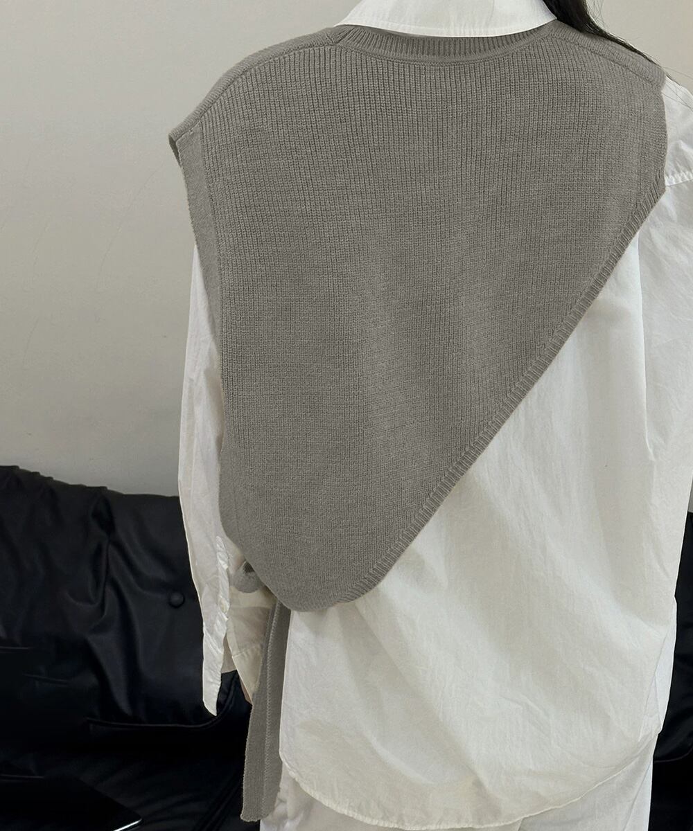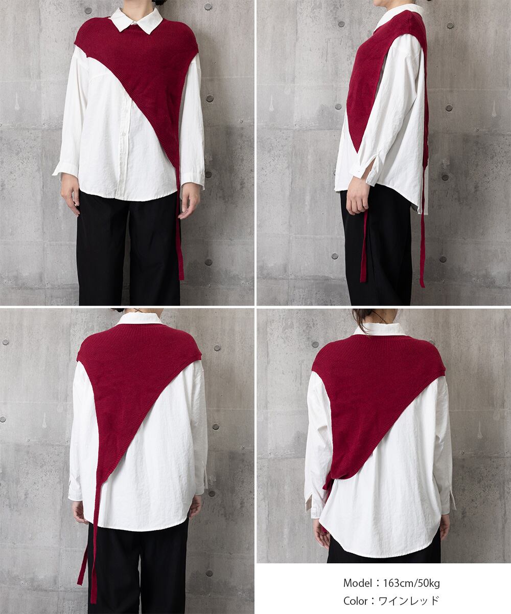 アシンメトリーなシルエットが目を引く三角ニットベスト。