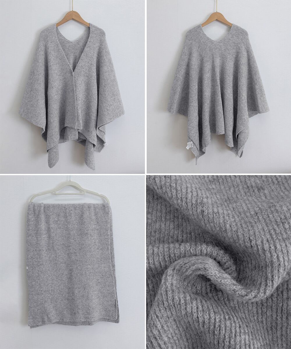 ストールのように羽織れる無地ポンチョ風ニットカーディガン。