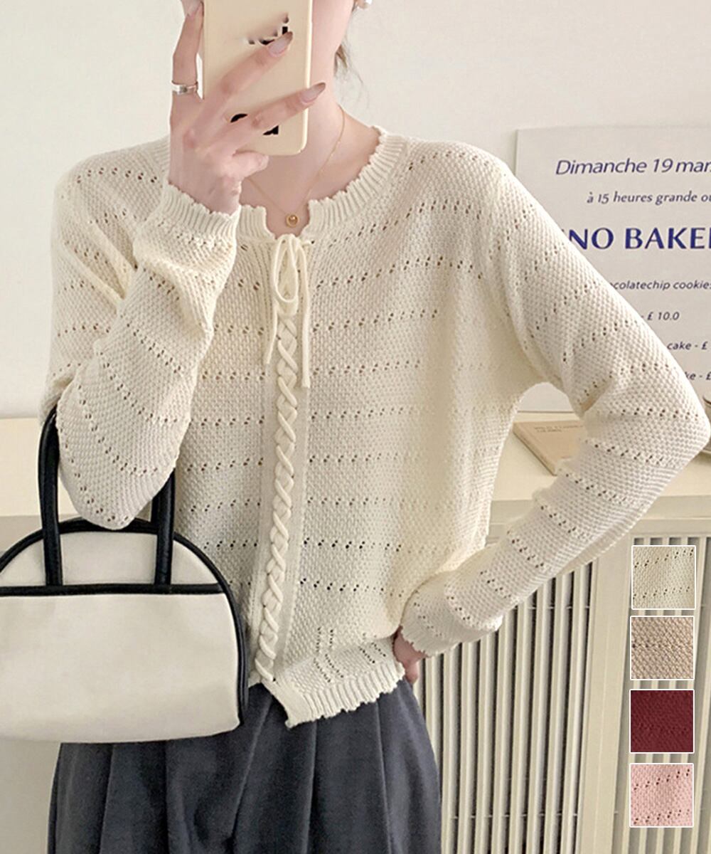 【日本倉庫即納】 ニットトップス リボンレースアップ春秋