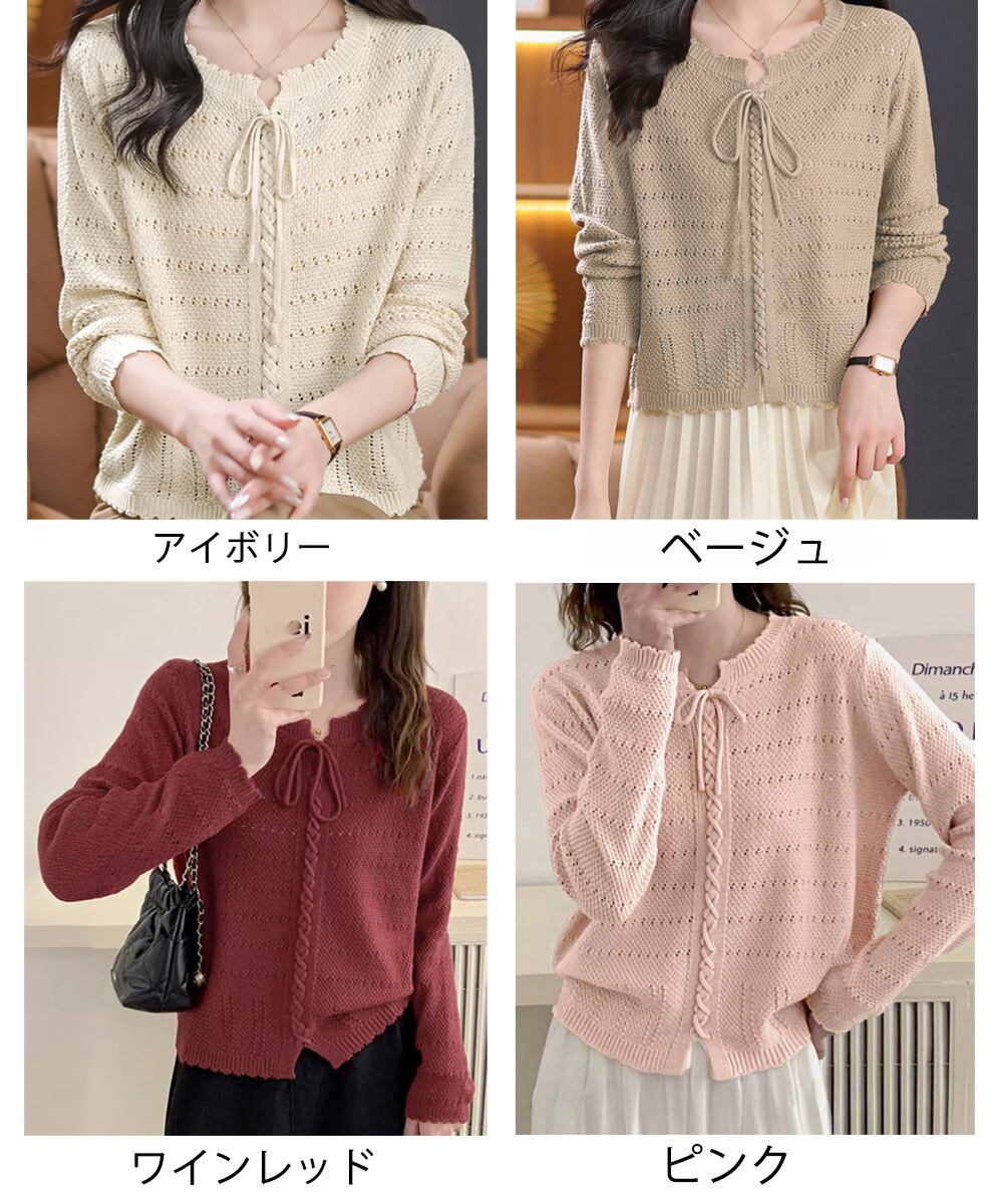 レディース 肌見せニット 長袖 ラウンドネック 無地 ニットセーター 通勤 透かし編みニット フェミニン 着回しトップス