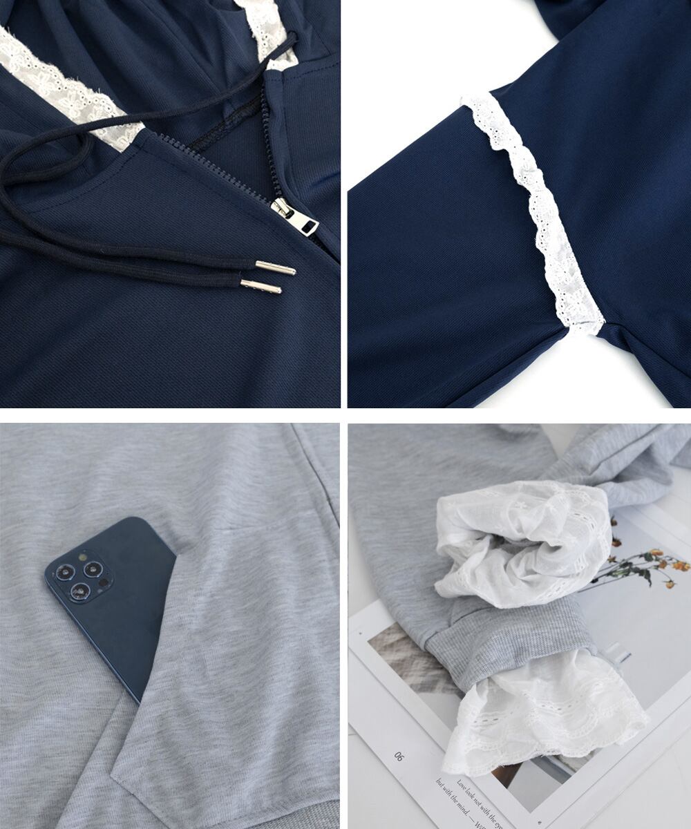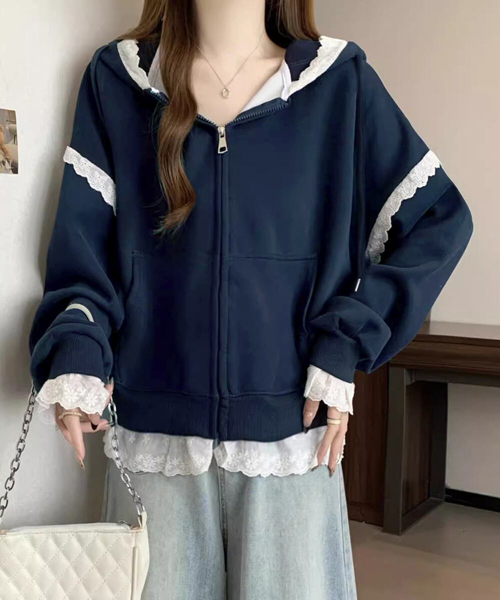 【日本倉庫即納】 パーカー レース切り替え 韓国風 ZIP