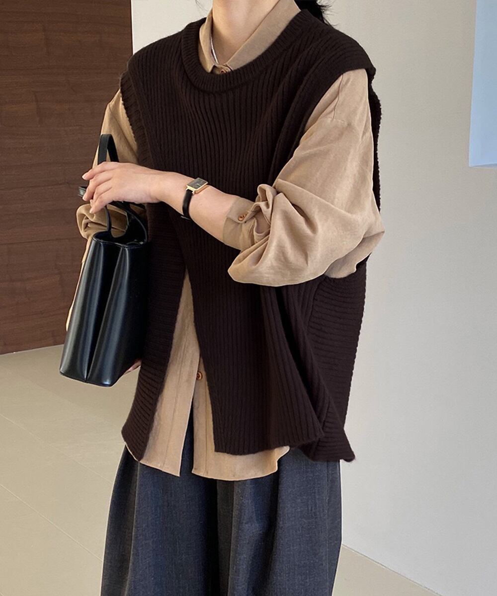 【日本倉庫即納】 リブニットベスト 前後スリットニットジレ