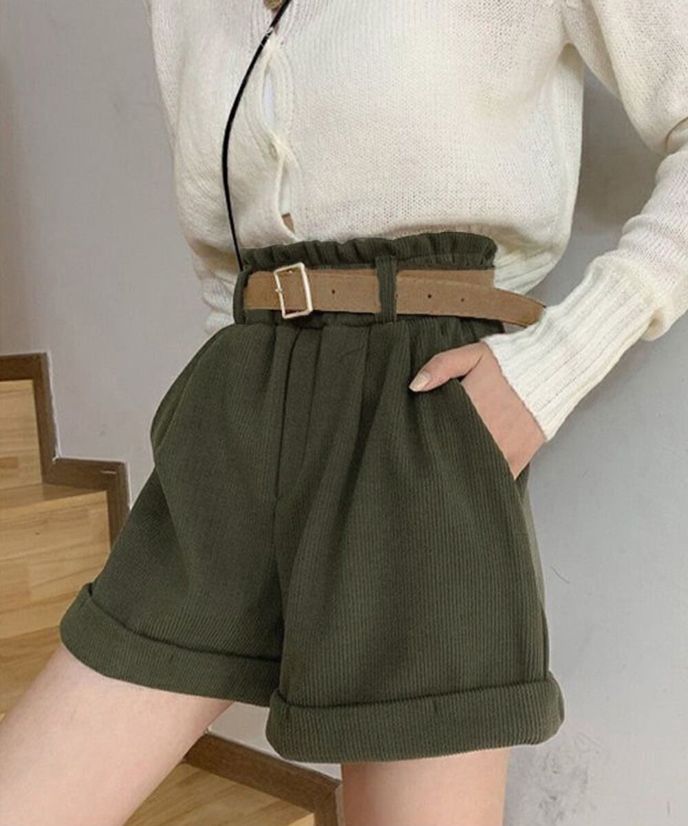 ハイウエストデザインとAラインシルエットで、脚長印象とスタイルアップを引き立てるベルト付きコーデュロイショートパンツ。