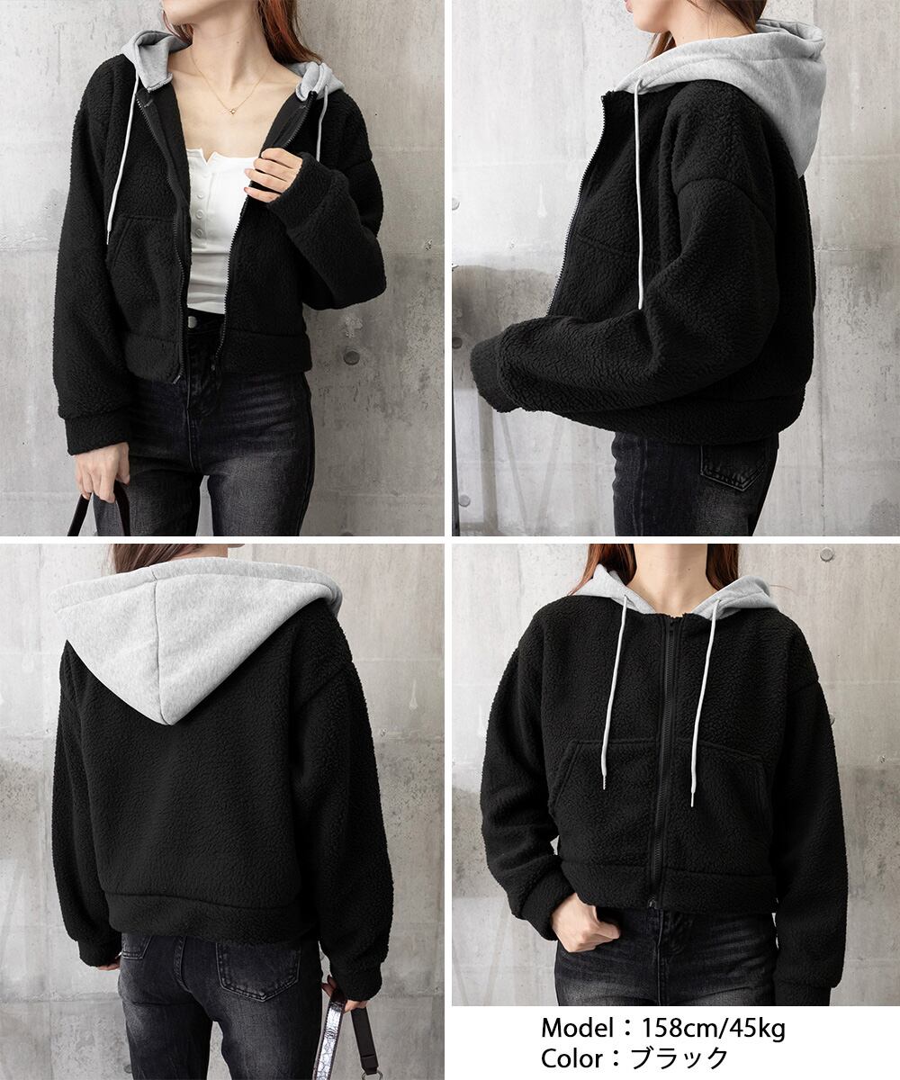 もこもこのボア素材で仕上げたショート丈レディースジップアップパーカー。