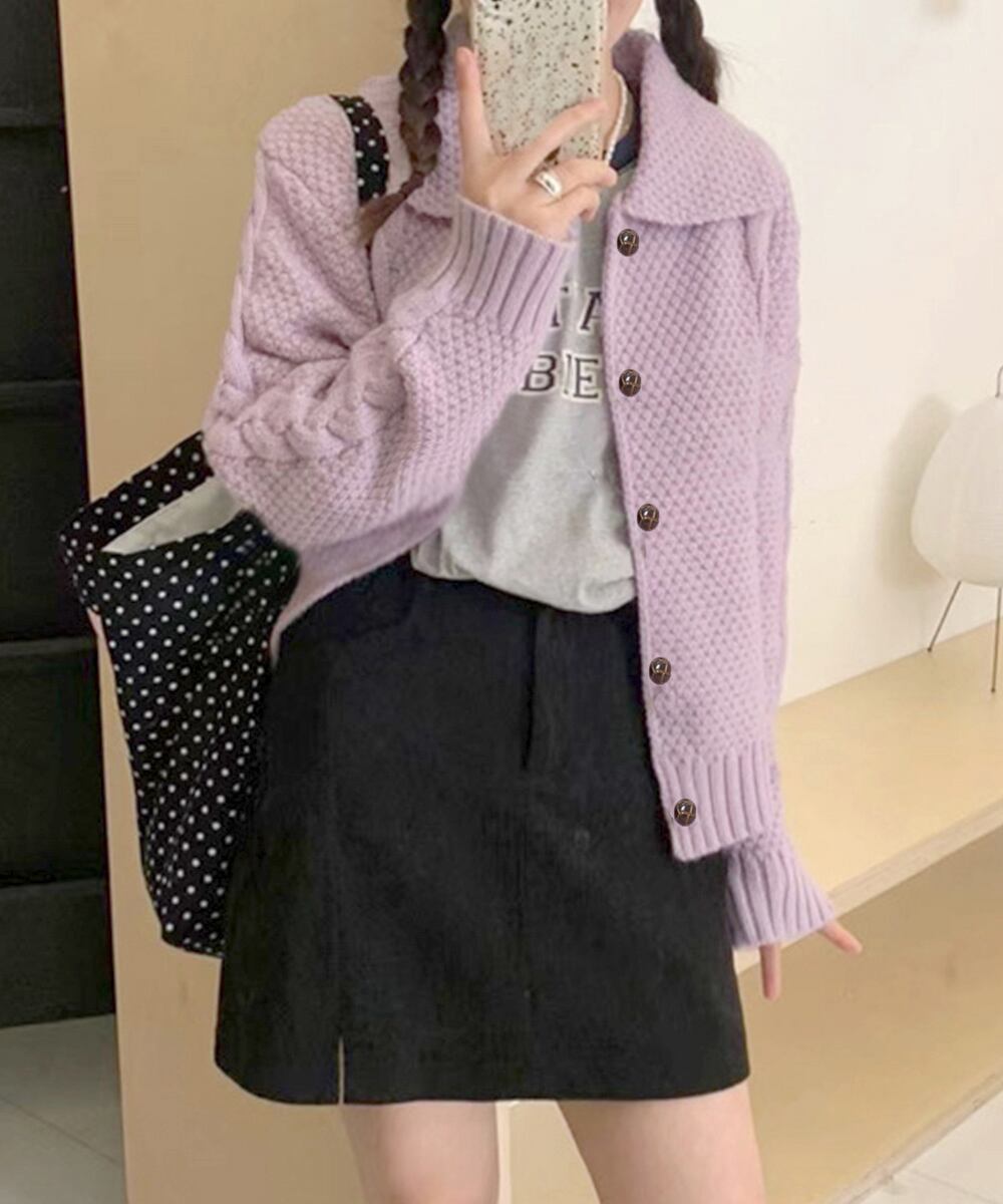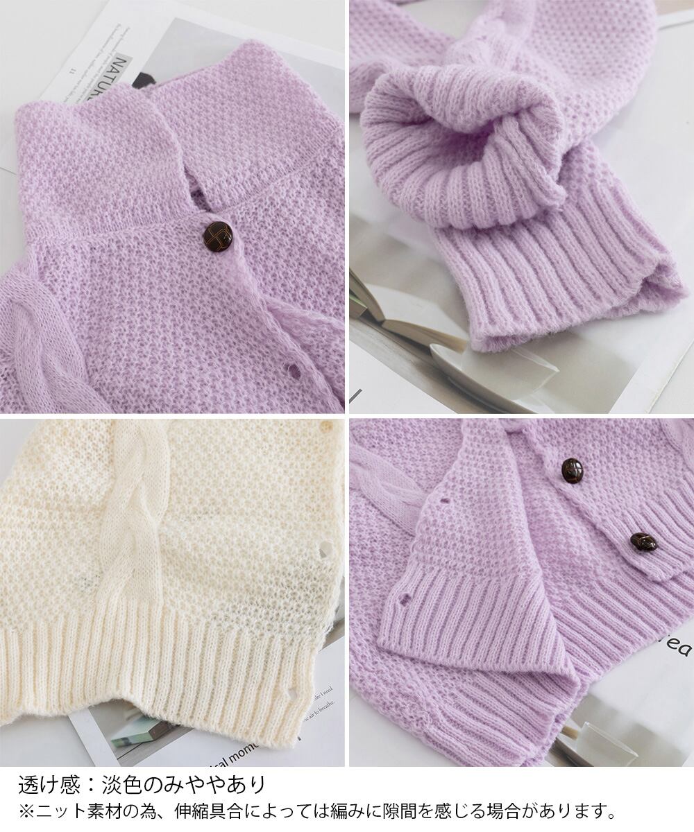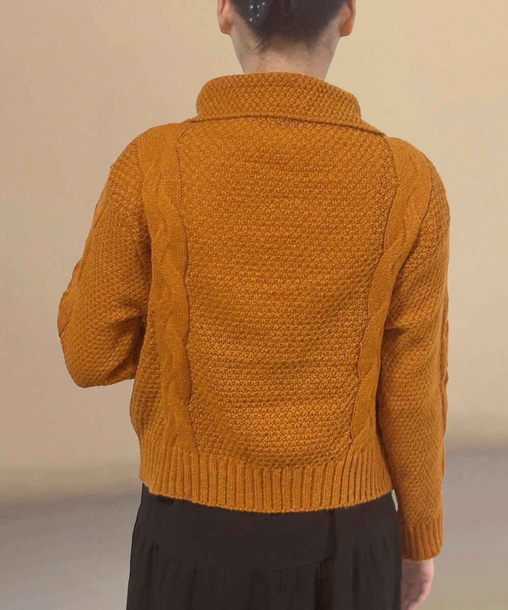 ざっくりとしたケーブル編みと立体感のあるビッグカラーが華やかさを添えるショート丈ニットカーディガン。
