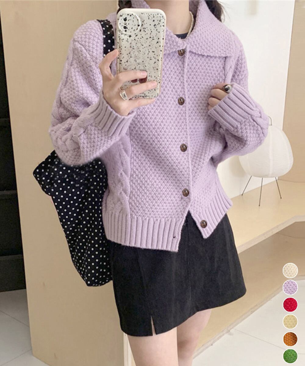 【日本倉庫即納】 ケーブル編みニットカーディガン ビッグ襟