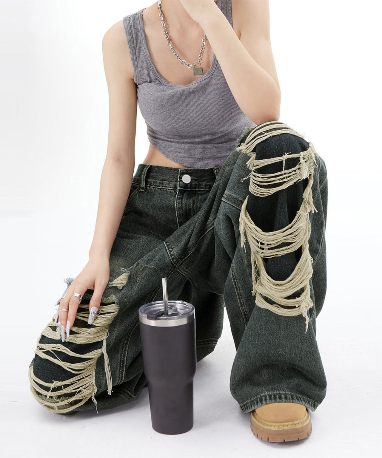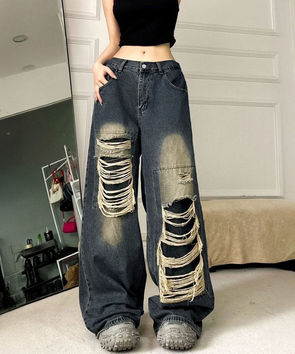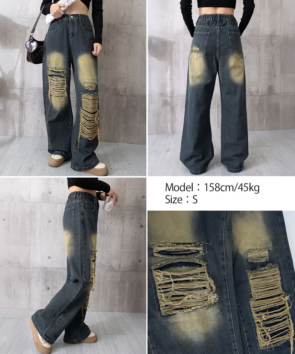 【日本倉庫即納】 ダメージバギーデニムパンツヴィンテージ風