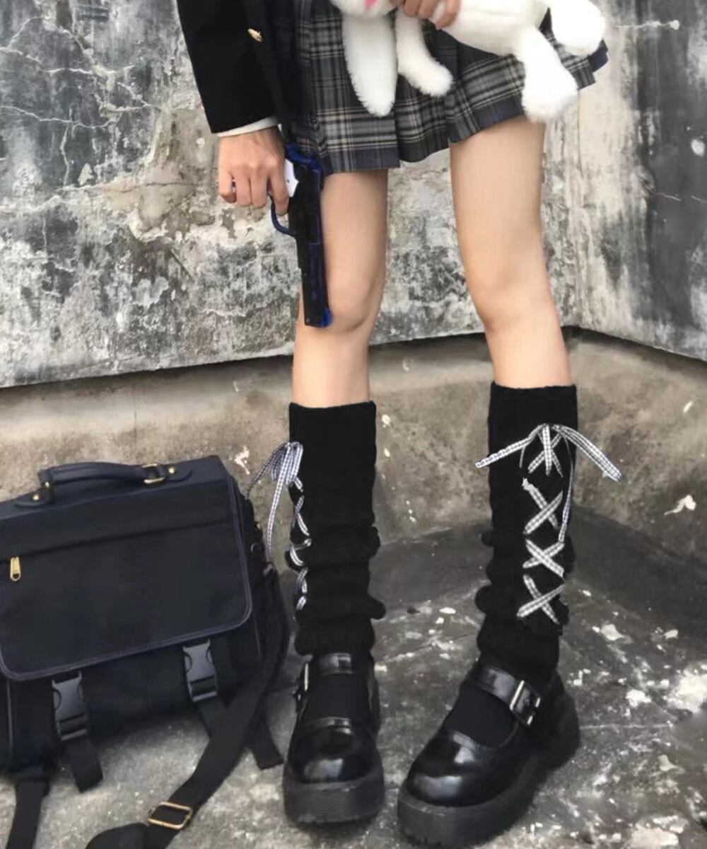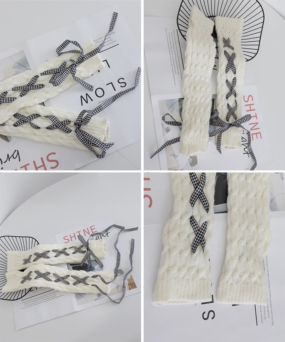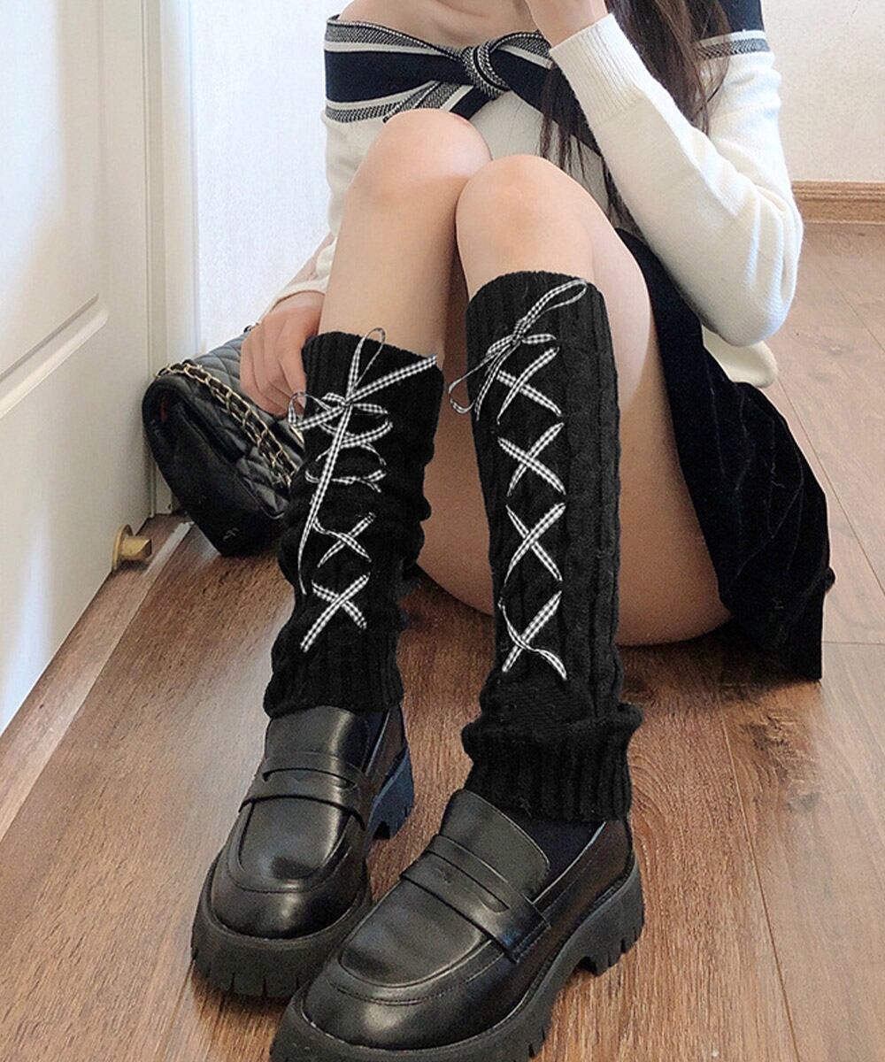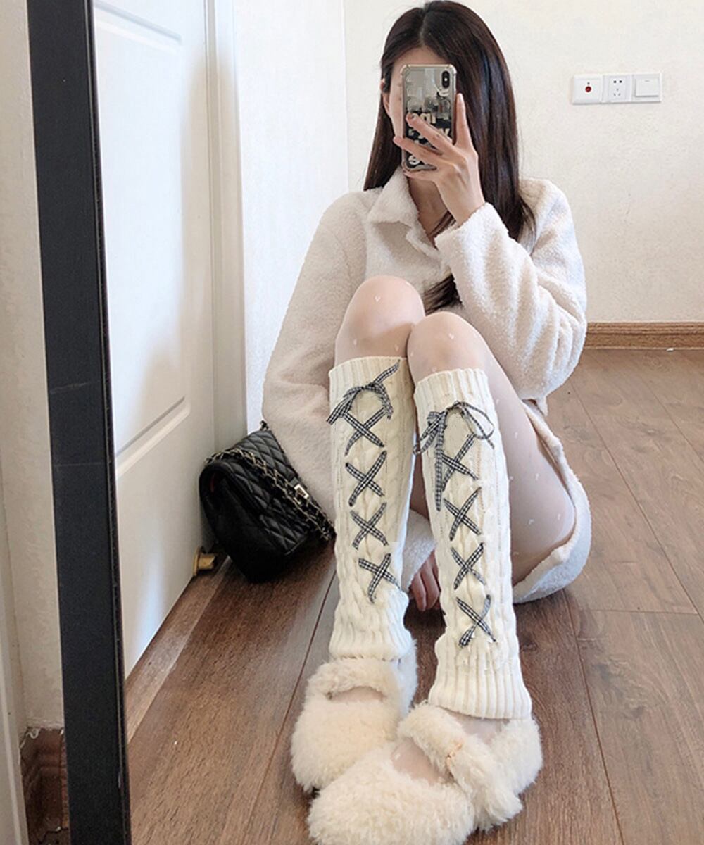 【日本倉庫即納】 レースアップニットレッグウォーマー暖かい