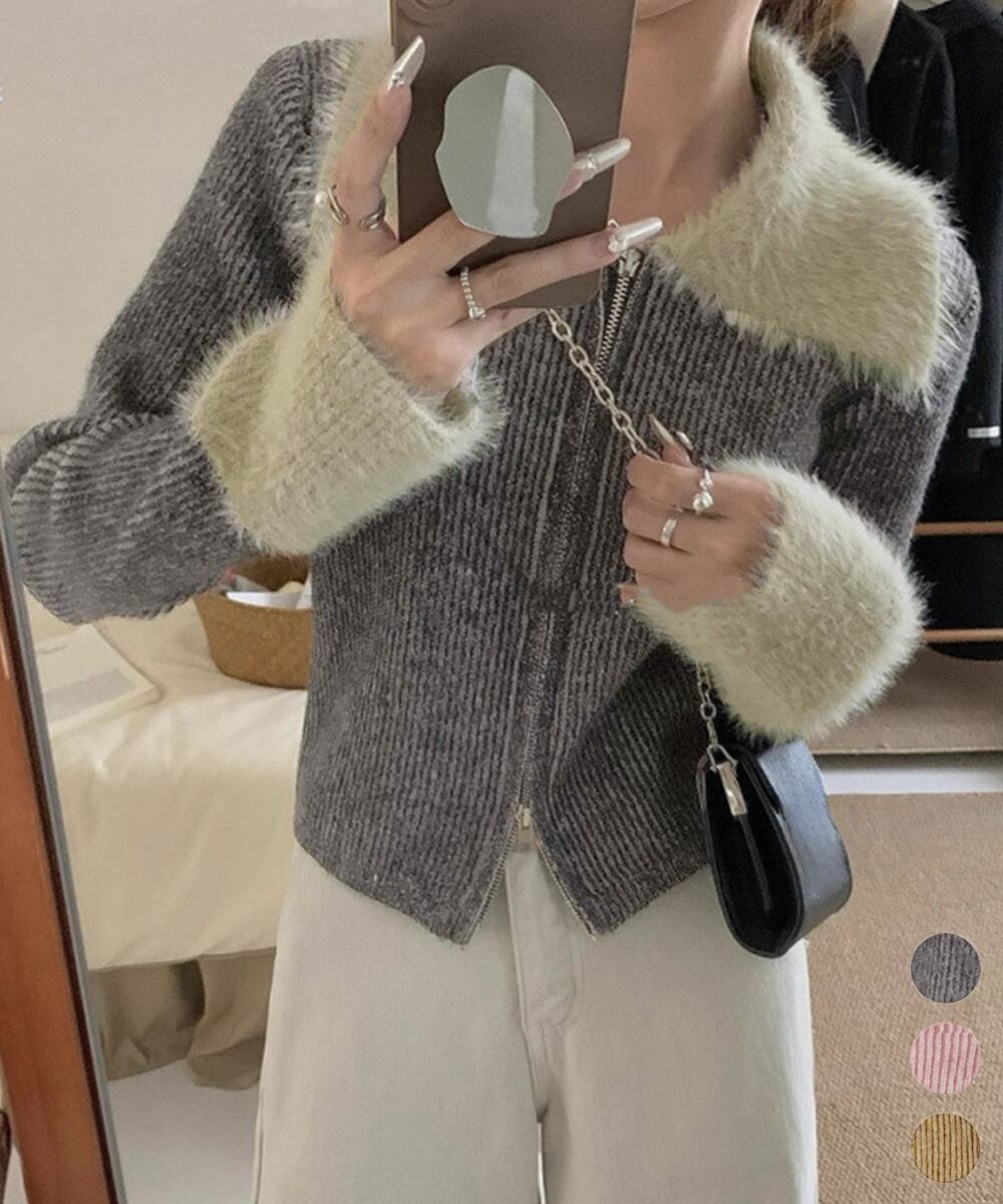 上品なフェイクファーをあしらったダブルジップアップ仕様のニットカーディガン。