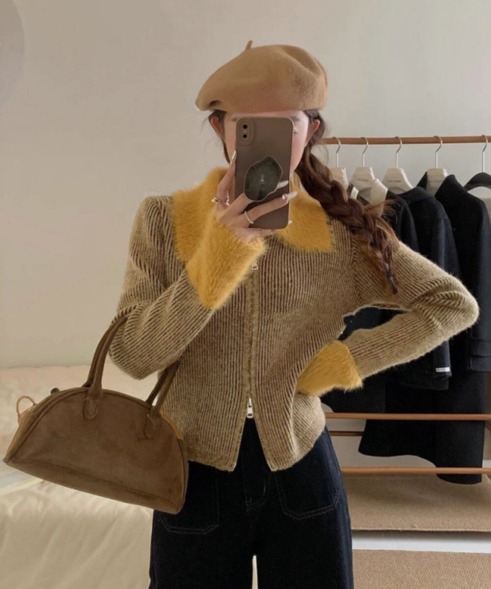 ファーカラー付き リブニットトップス 秋冬配色ニット レディースバイカラー長袖カーディガン 前開き2wayニットセーター