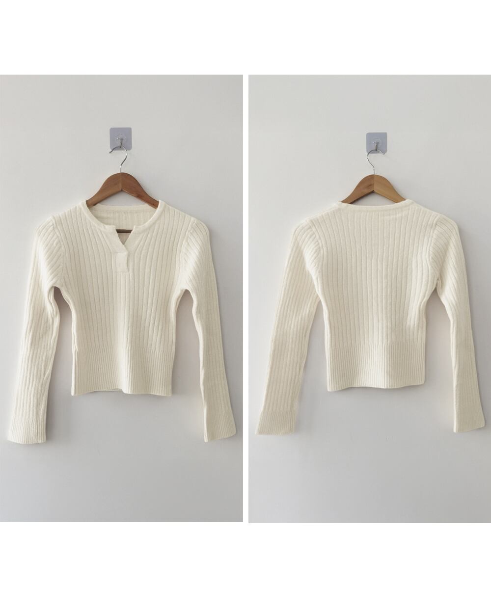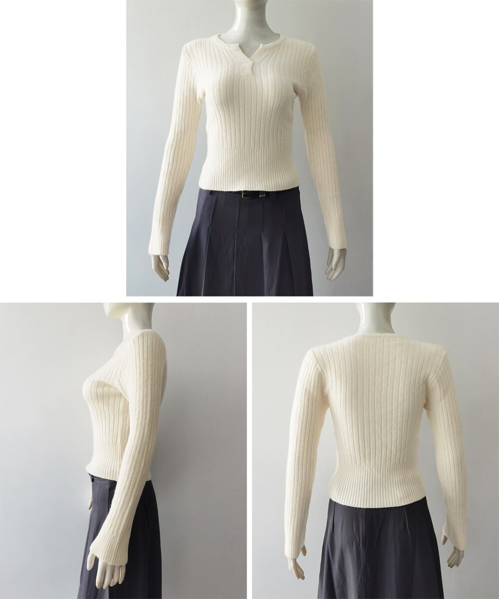 すっきり見えるリブ編みデザインの長袖ニットトップス。