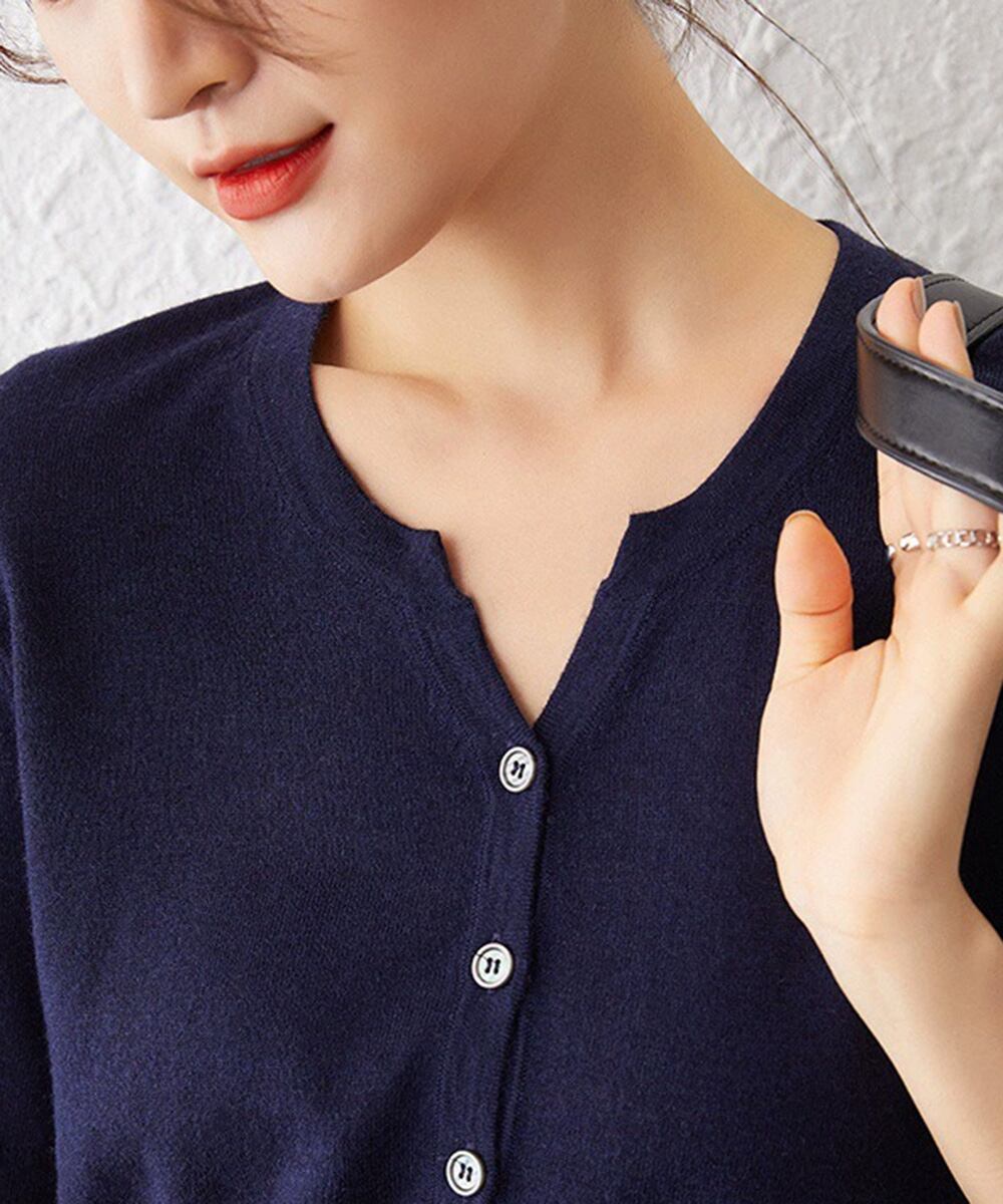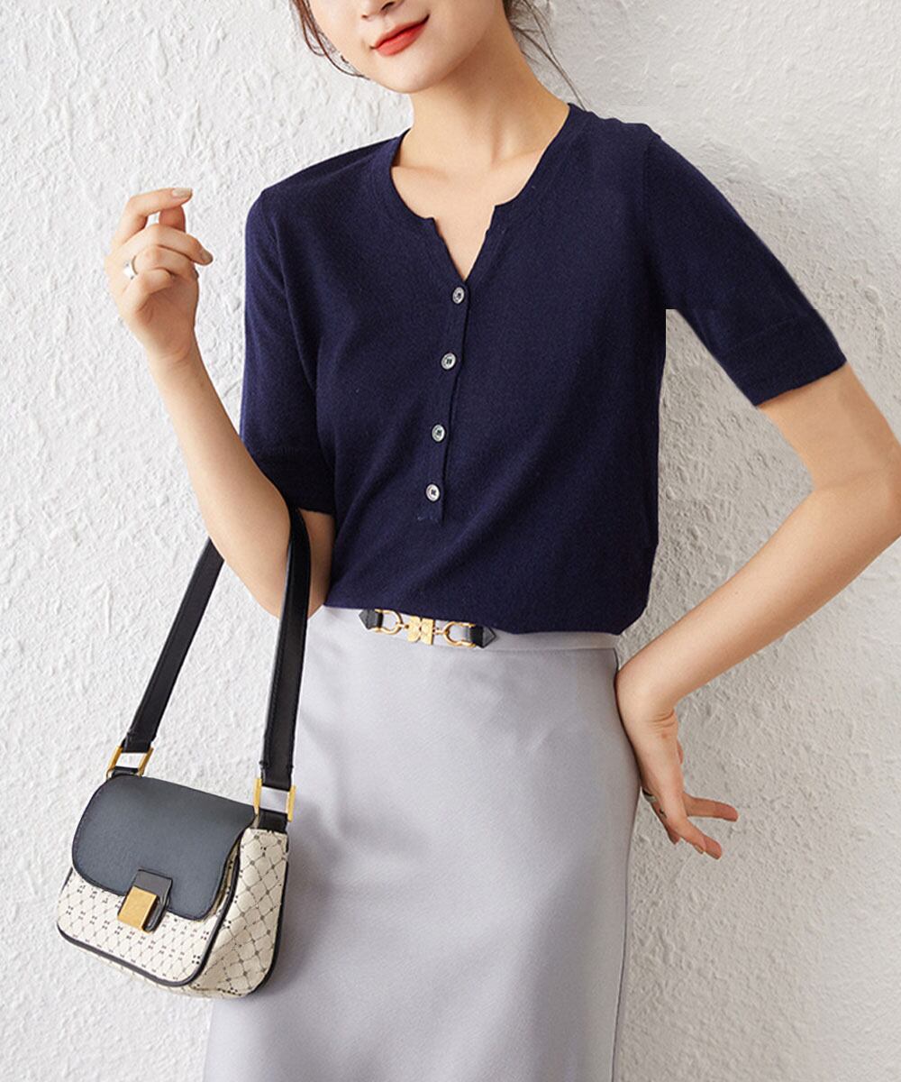 すっきりとしたシルエットが魅力のVネック半袖ニットトップス。