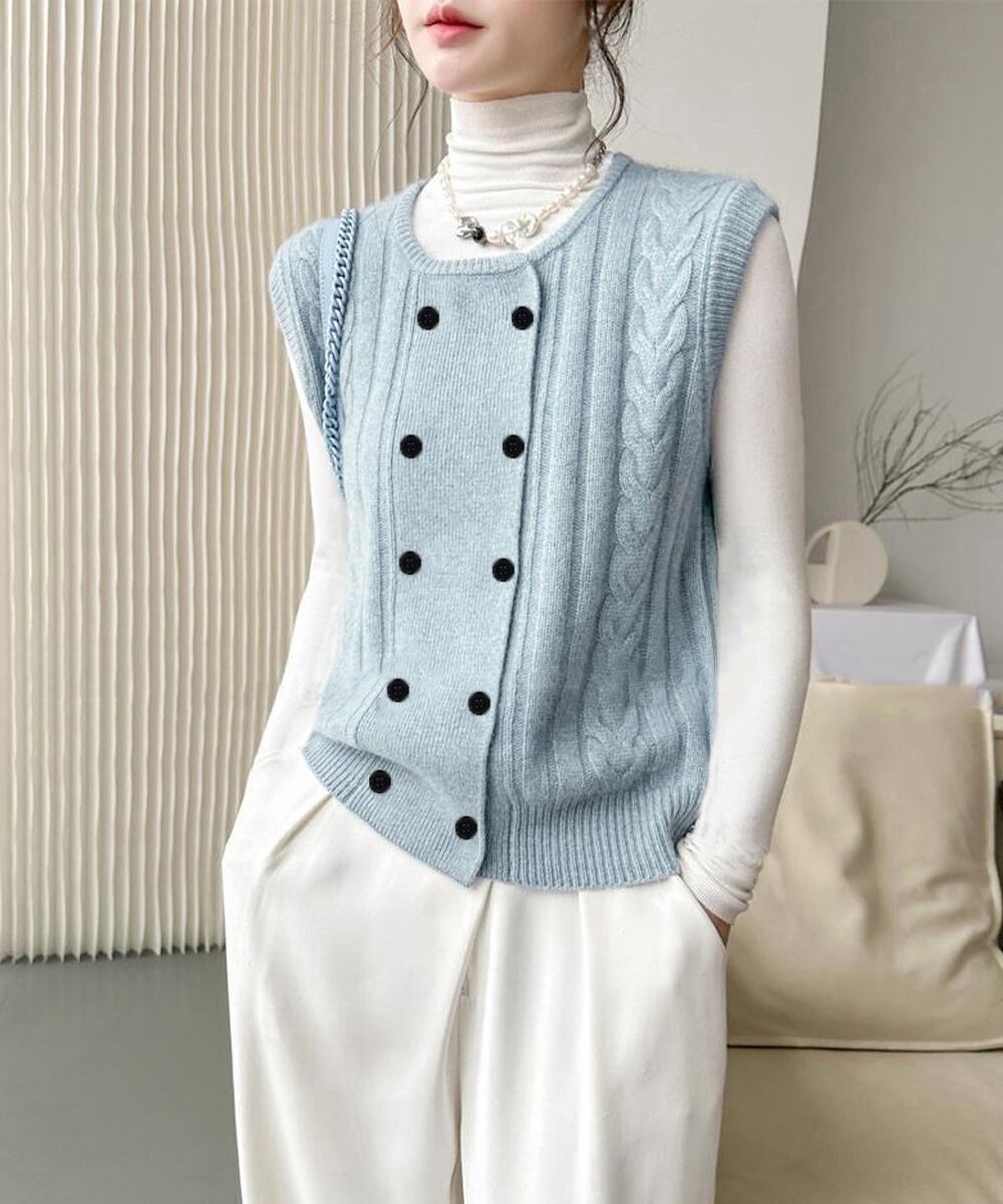 クラシカルな雰囲気漂うケーブル編みのダブルブレストニットベスト。