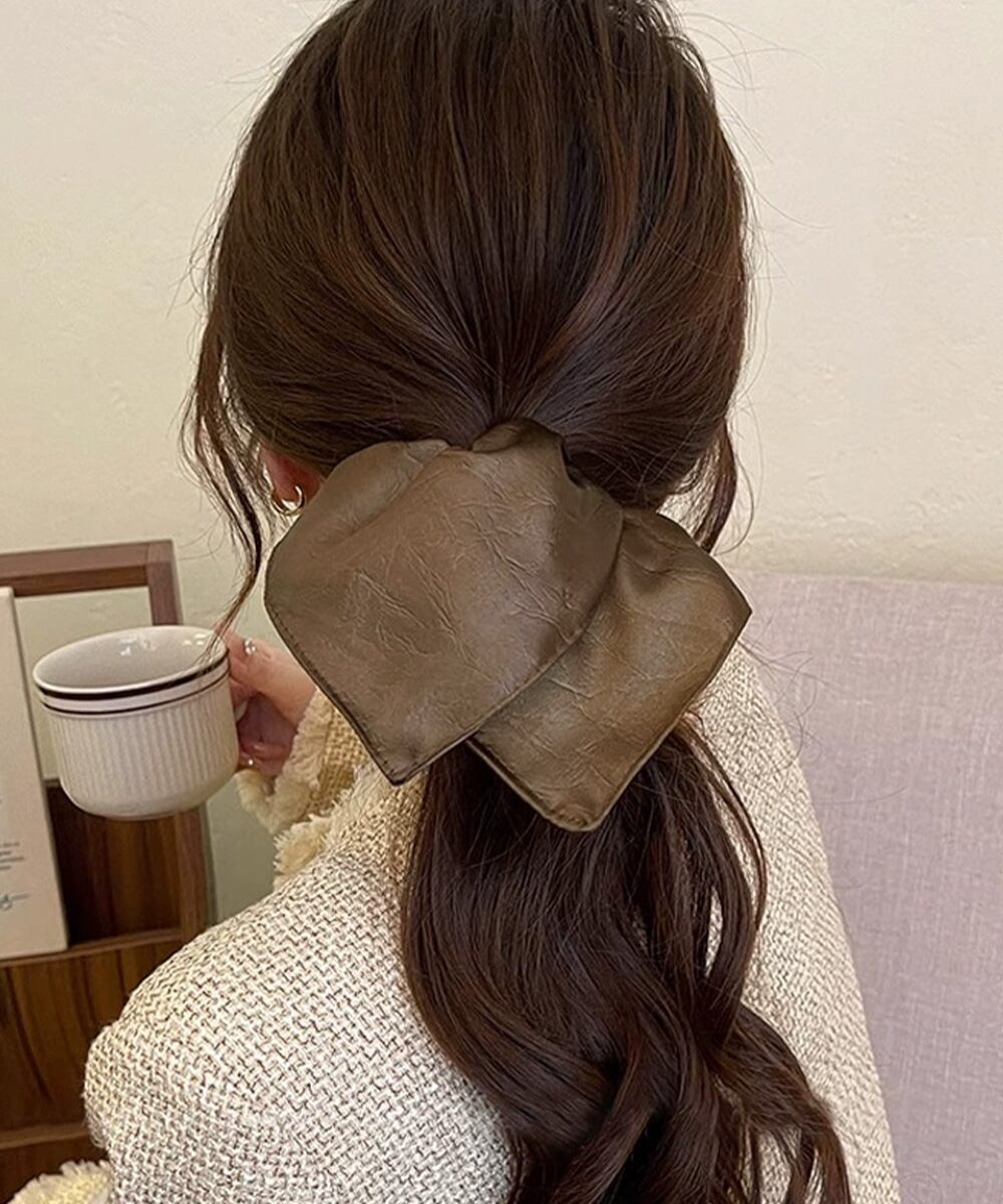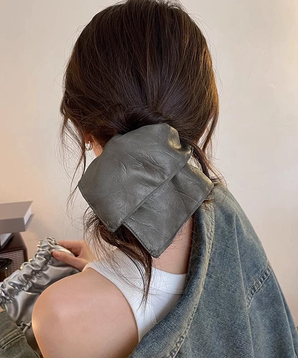 上質なフェイクレザーを使用したスクエア型の大きめシュシュ。