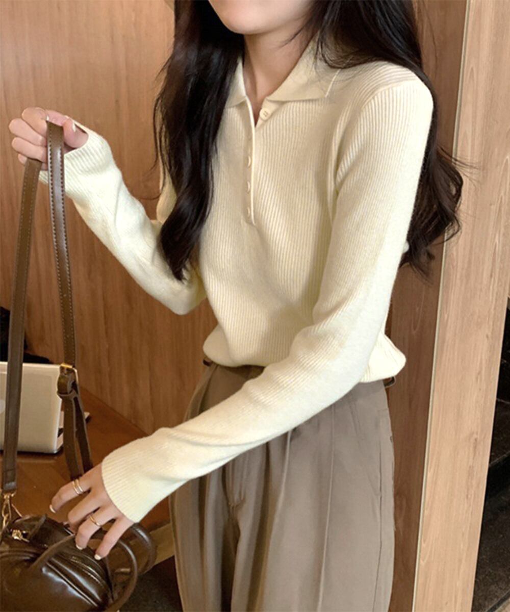 シンプルながらも洗練された印象を与えるポロリブニットトップス。