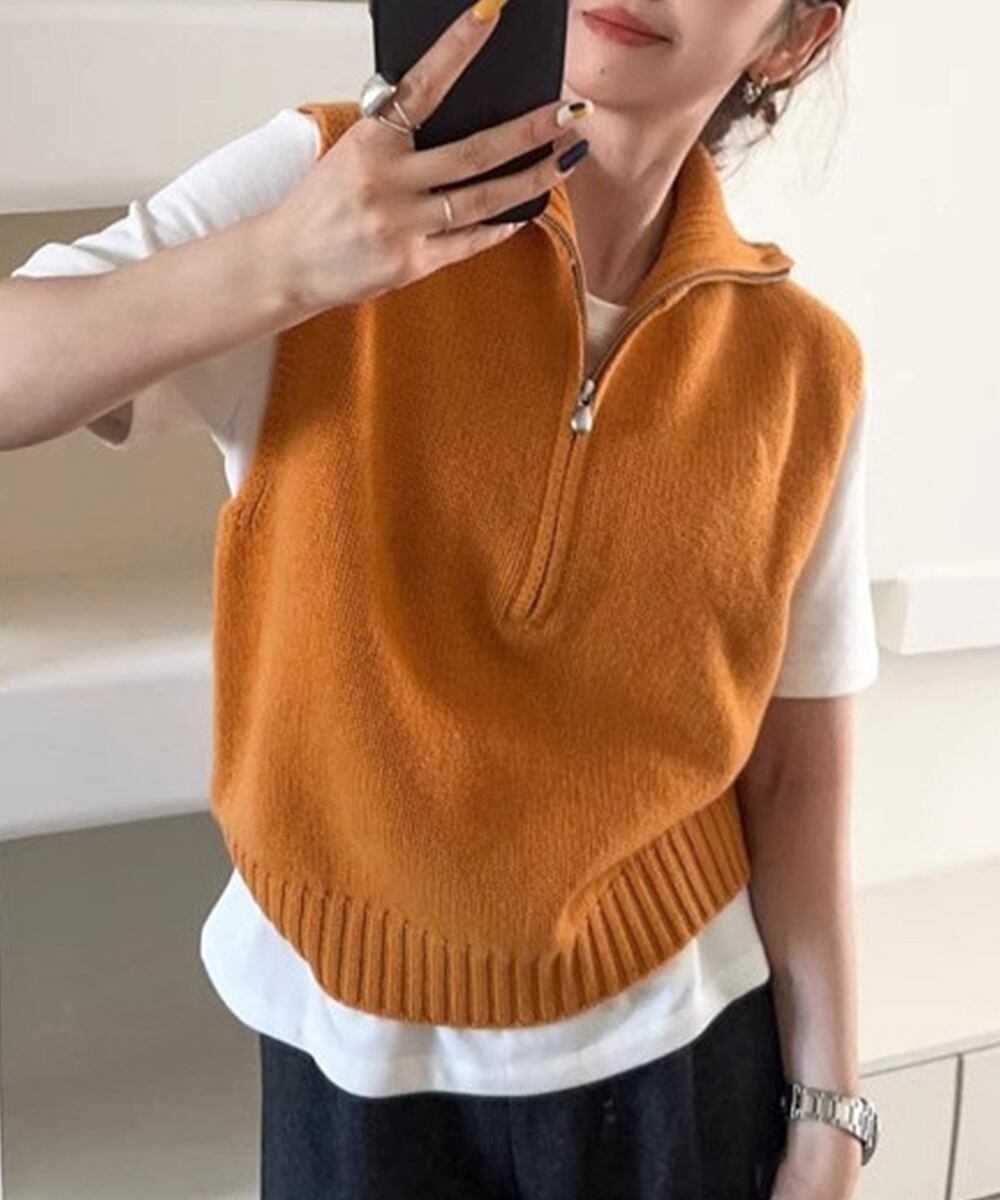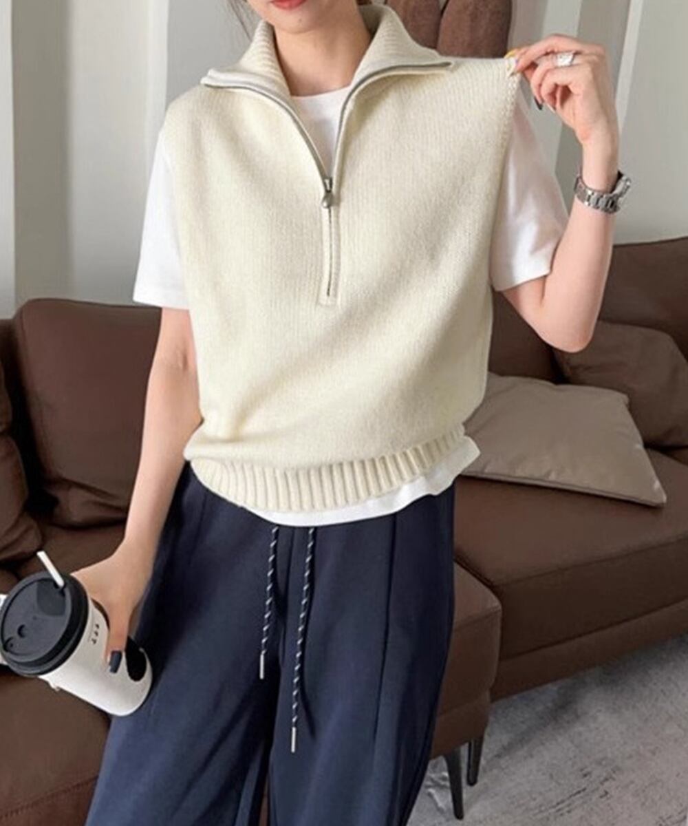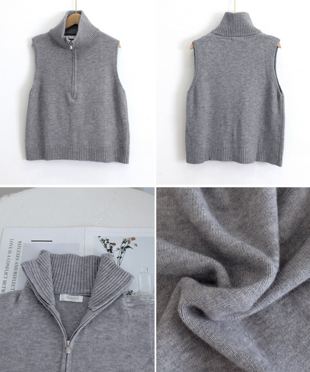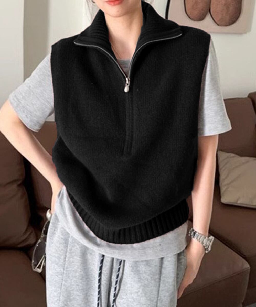 スタンドカラーとハーフジップが特徴的なニットベスト。