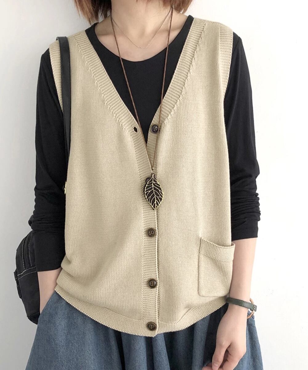 無地ニットチョッキ 重ね着 ニット羽織 着やせニット春秋冬