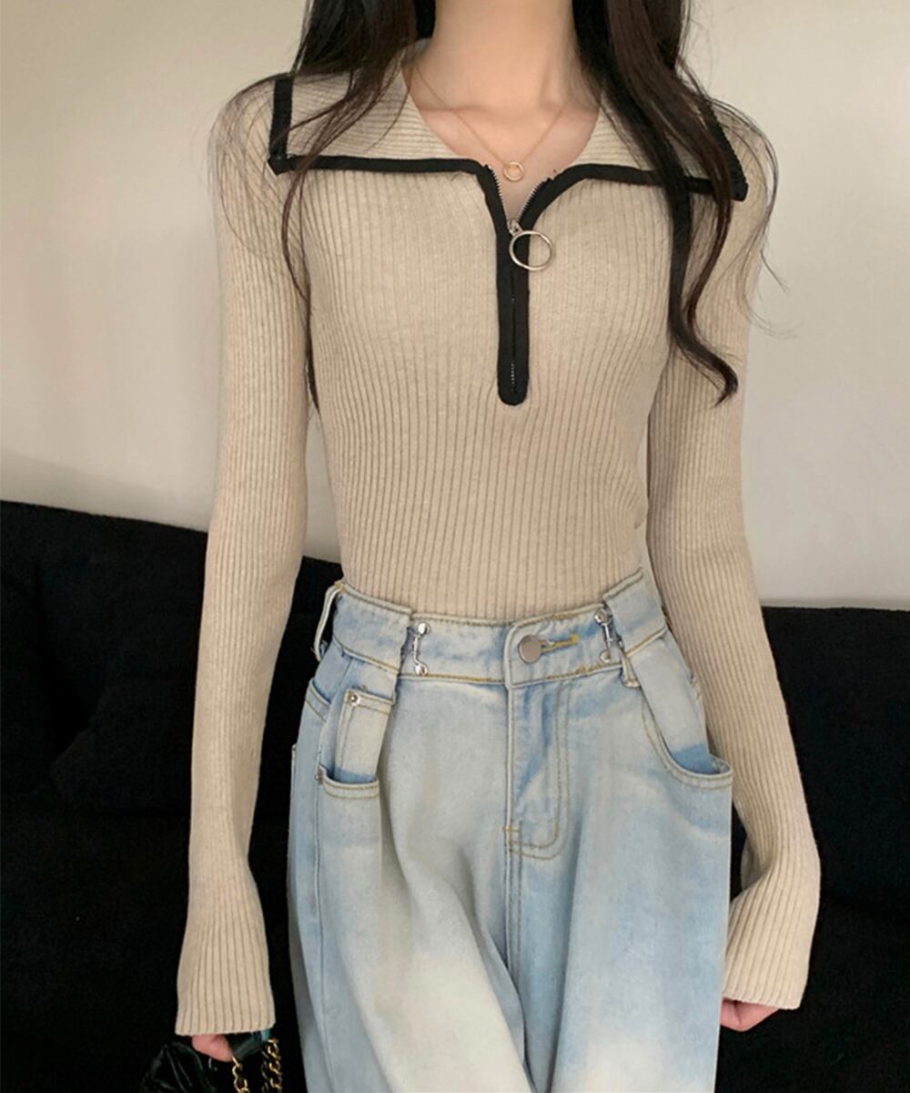 ファスナー付きニットトップス。