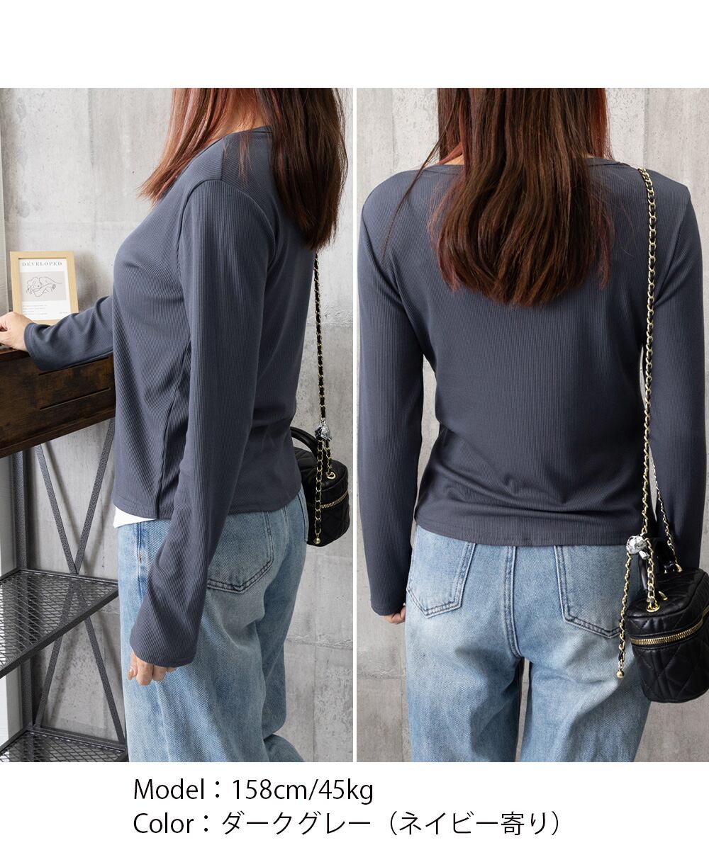 着やせトップス 黒 長袖タイトtシャツ 細身カットソー無地