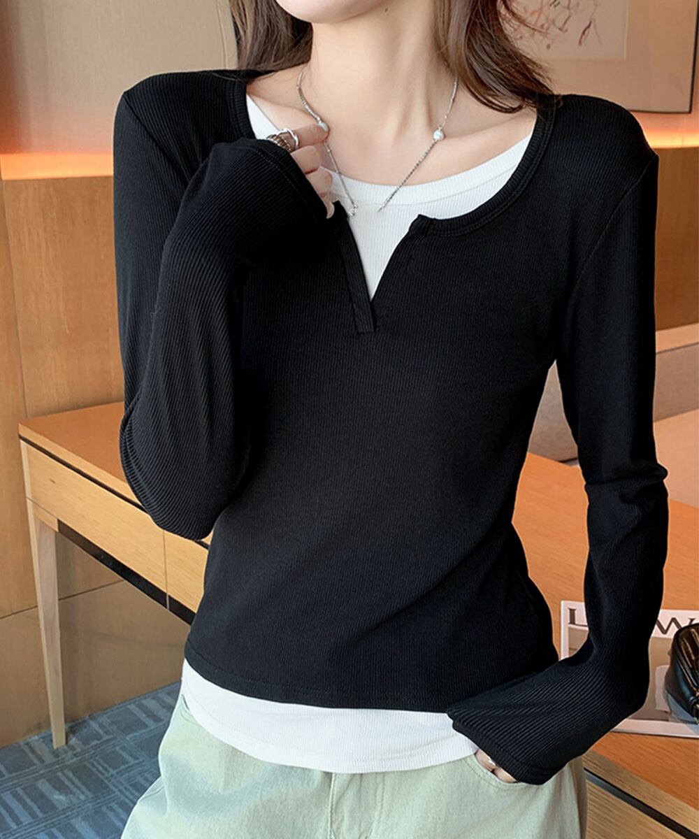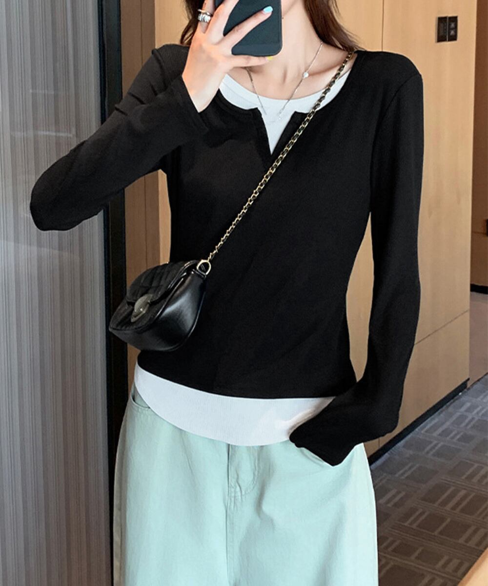 【日本倉庫即納】 レイヤード風Tシャツ スリットネック秋服